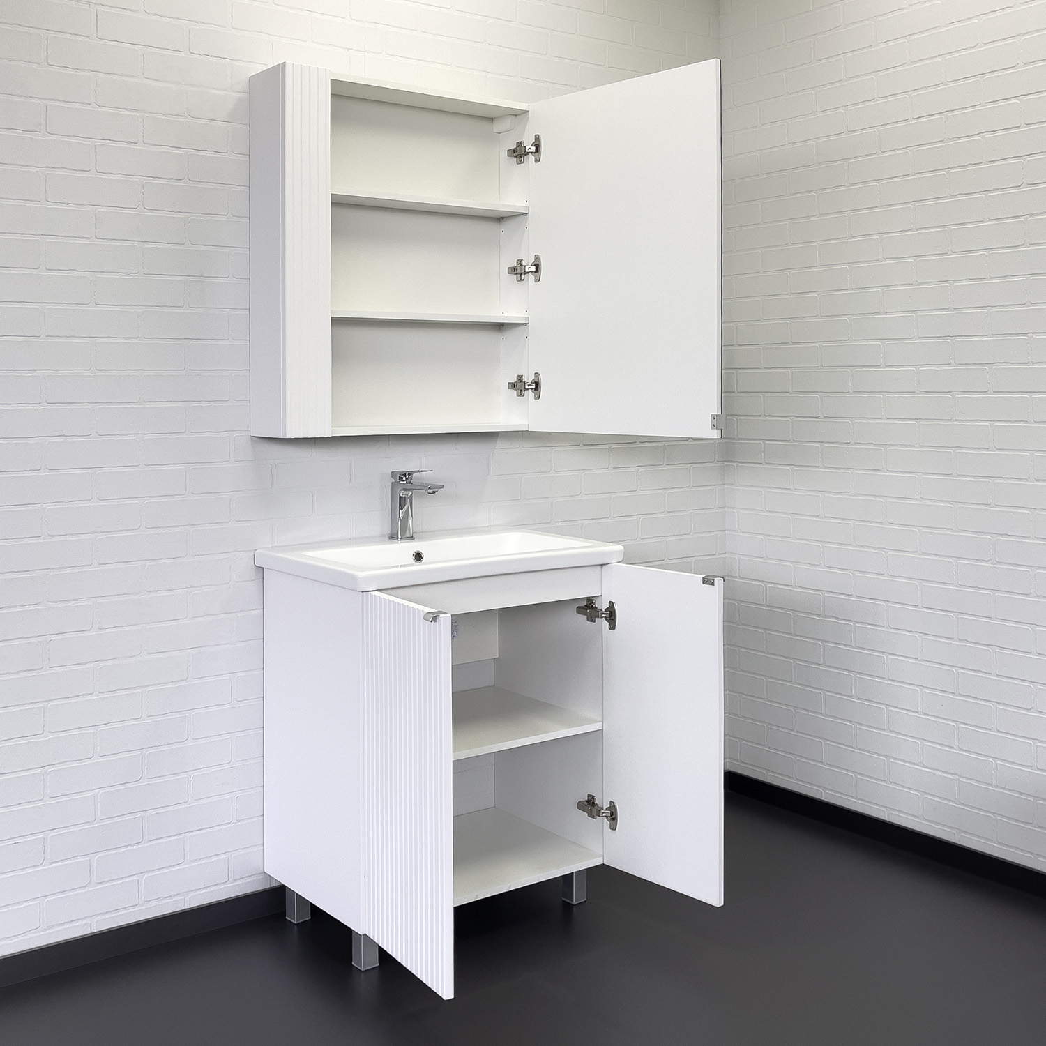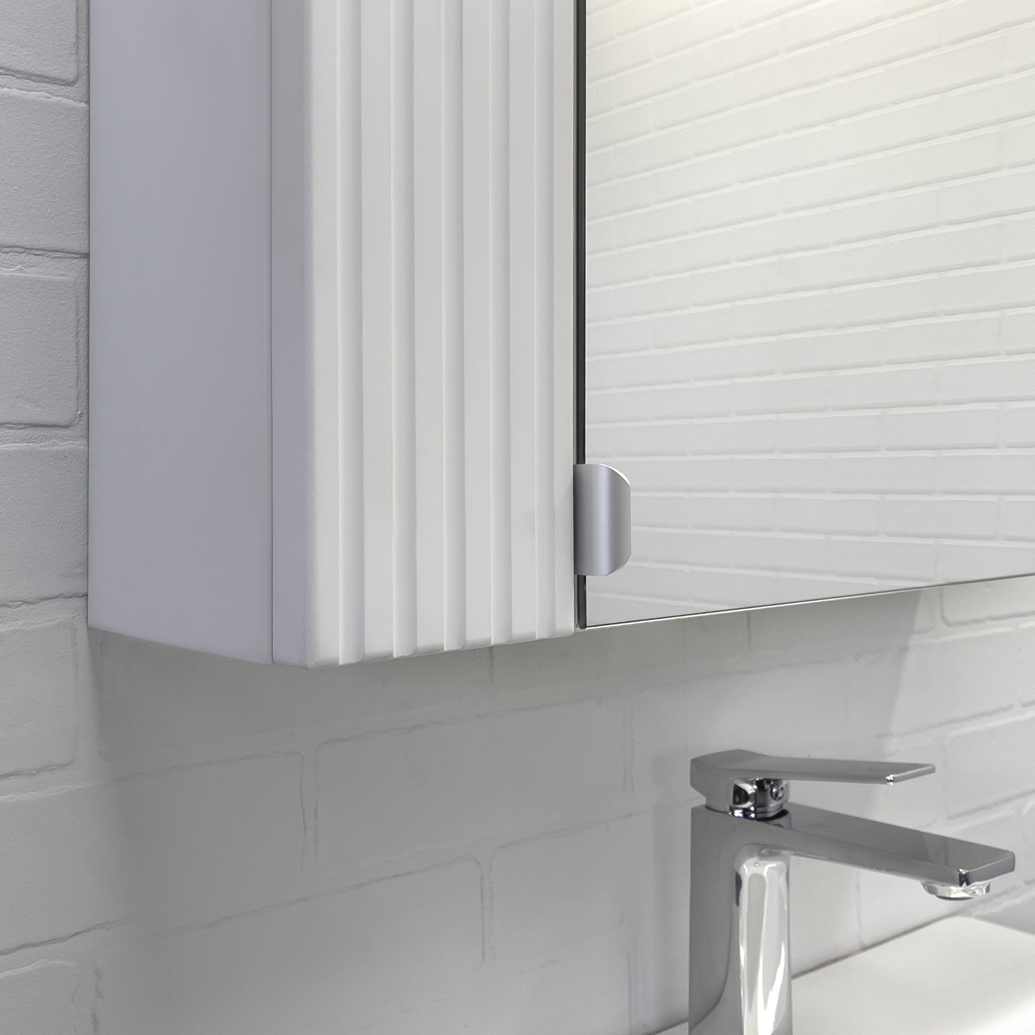 Зеркальное высококачественное полотно с амальгамой на основе серебра. Створка декорирована вертикальной фрезеровкой и оснащена петлями плавного закрывания. За створкой две полки. В модели применяется плёнка с бархатистой поверхностью.