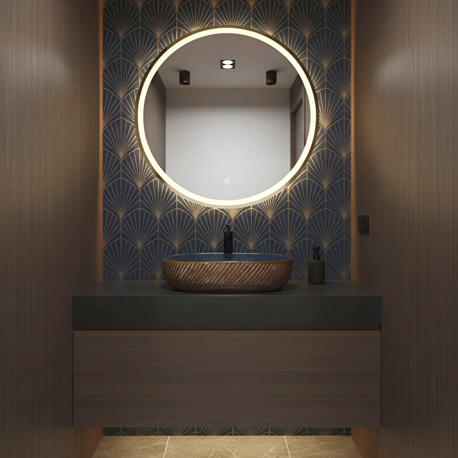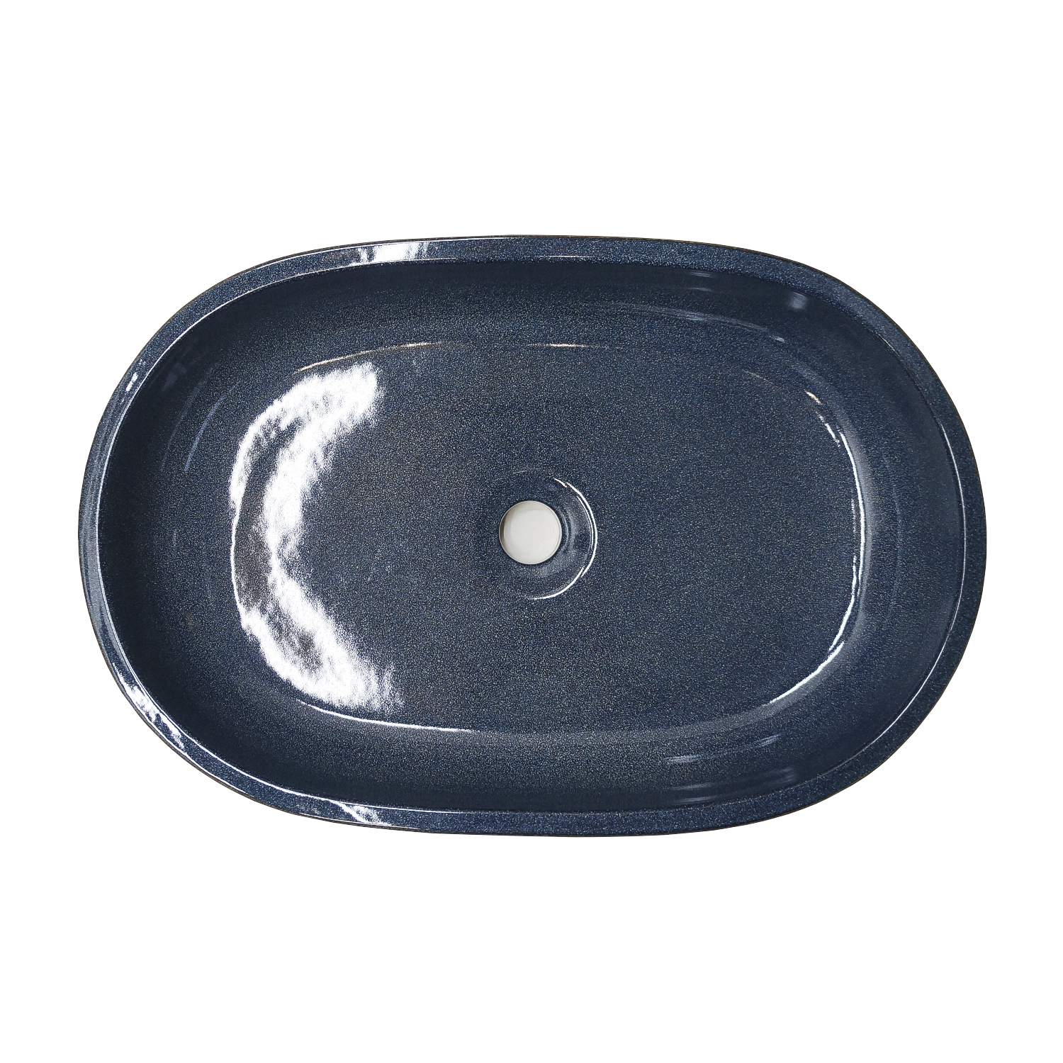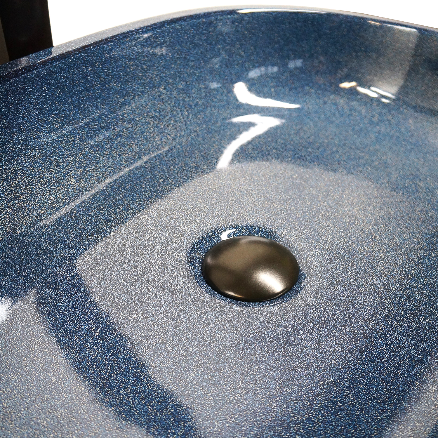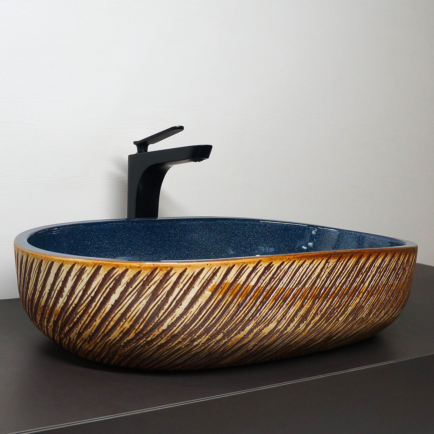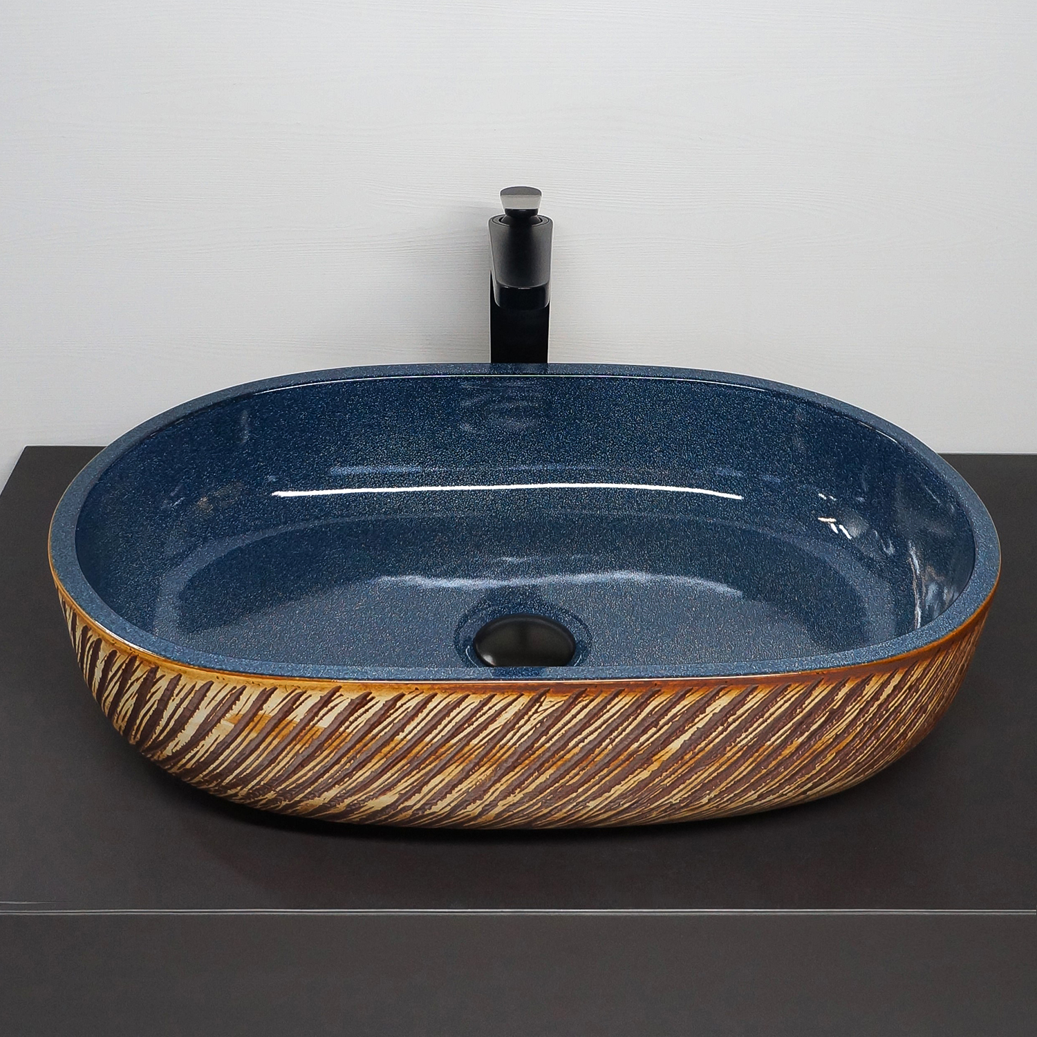 Глубокий янтарно‑синий цвет и глянцевая поверхность фарфора создают игру света и делают раковину выразительным элементом интерьерной композиции.