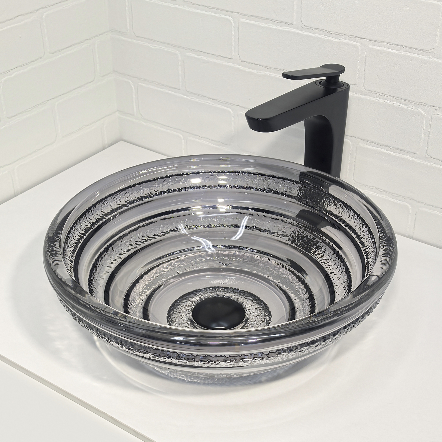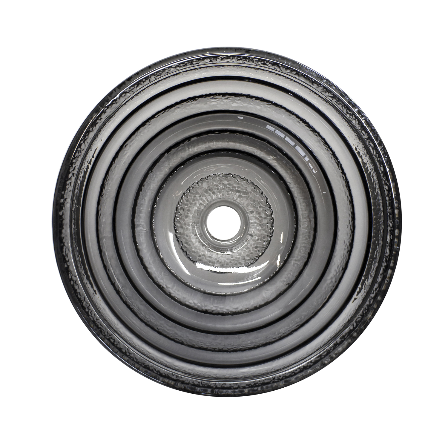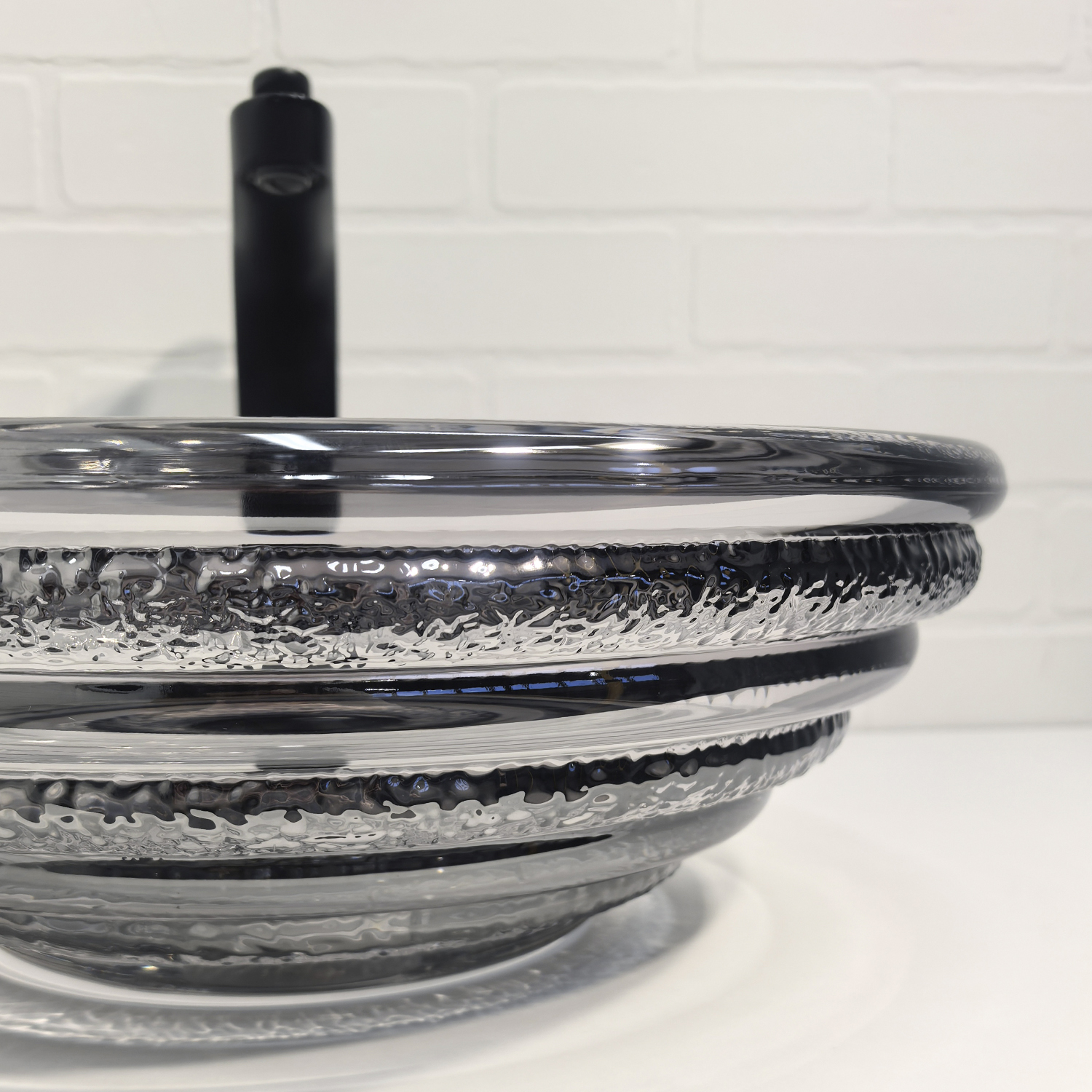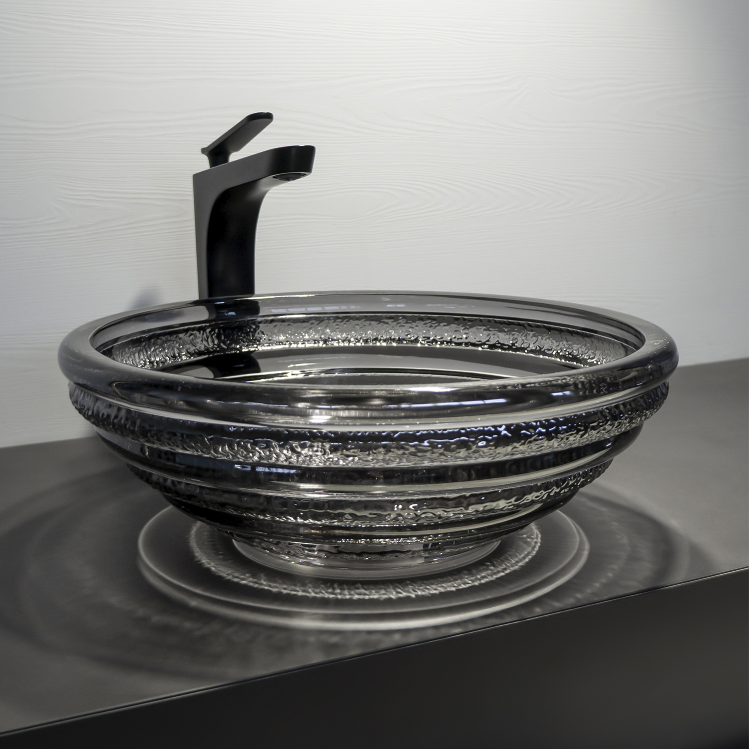 Круглая форма и объёмные фактурные полосы создают игру света и визуальную глубину, благодаря чему раковина смотрится легкой и одновременно солидной. Нейтральный серо-прозрачный оттенок органично сочетается с любыми цветами плитки и мебели — от белых минималистичных интерьеров до лофта и темных ванн.