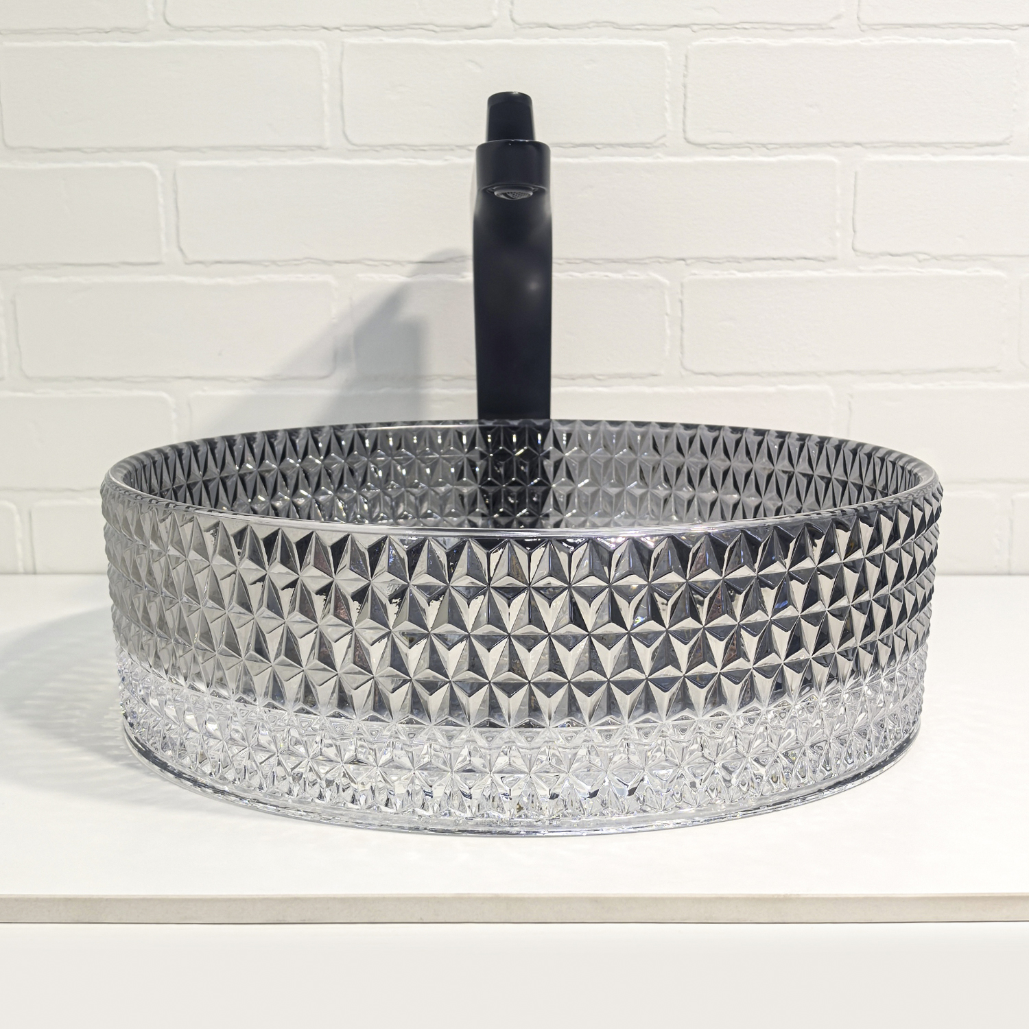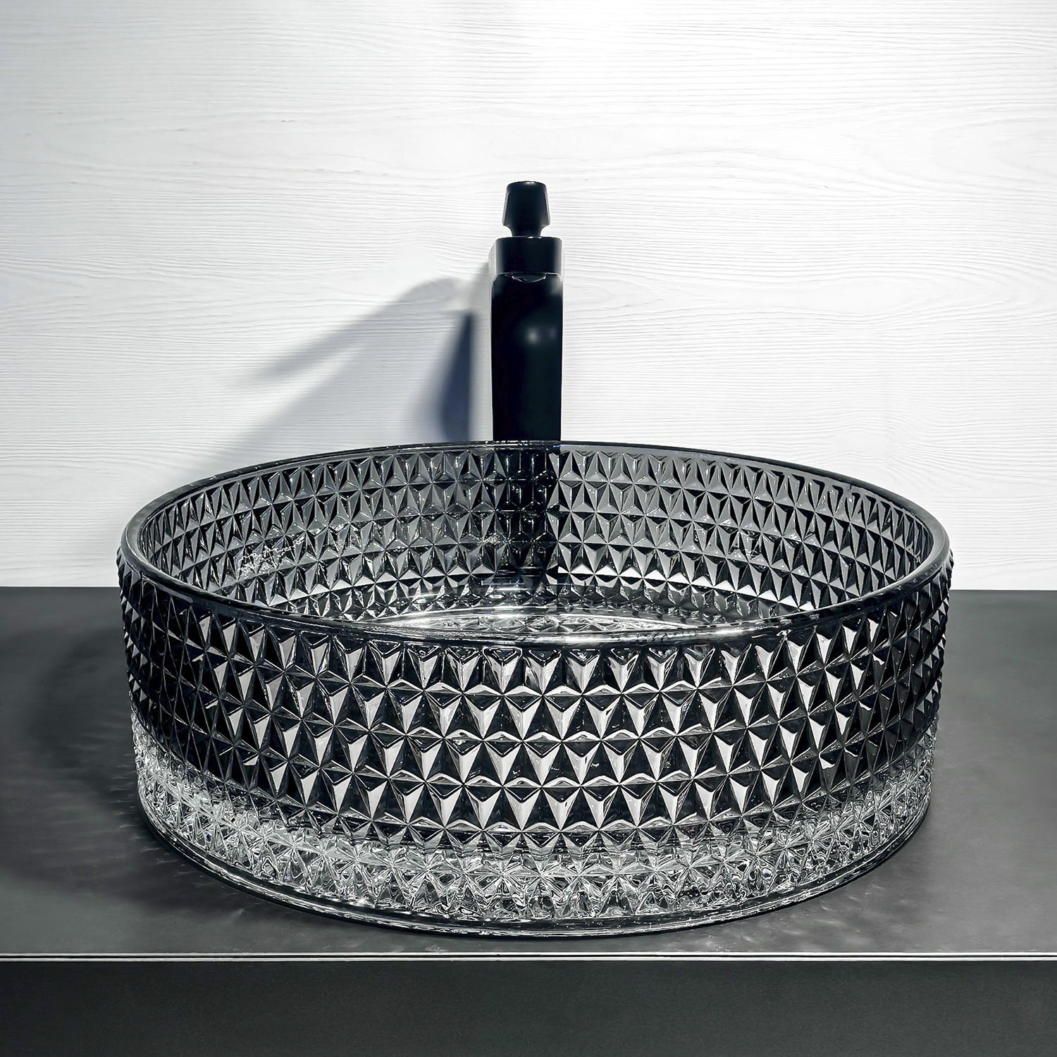 Градиентный серый оттенок от прозрачного дна к более насыщенному бортику создаёт эффект глубины и визуально «подсвечивает» воду, органично сочетаясь как с белой сантехникой, так и с тёмной мебелью.