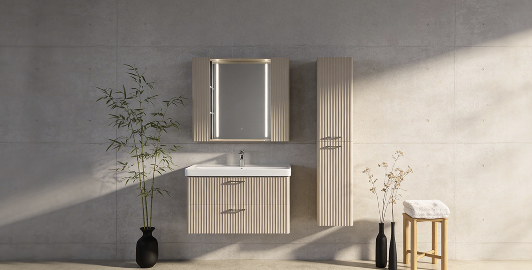 Рядом шкаф-колонна Ангара 35 в том же цвете, зеркало с подсветкой. Добавьте акценты Джапанди: бамбуковые ветви или минималистичные черные вазы с сухоцветами, белый пушистый полотенец свёрнутый, деревянные подставки.