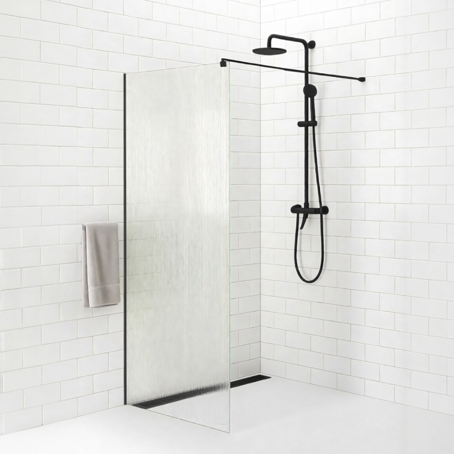 Душевое ограждение WALK-IN серии 916 – это современная стационарная перегородка шириной 700 мм из прочного закалённого стекла толщиной 8 мм с рифлёной прозрачной фактурой, рассчитанная на установку в душевую зону без поддона или с поддоном вровень с полом.