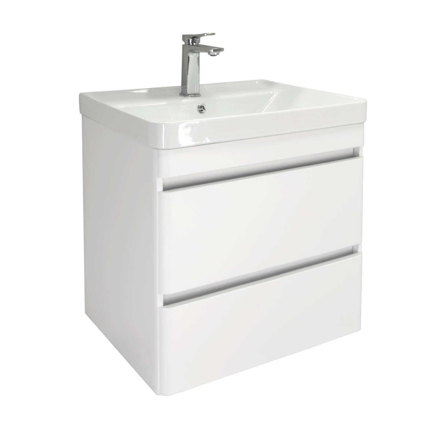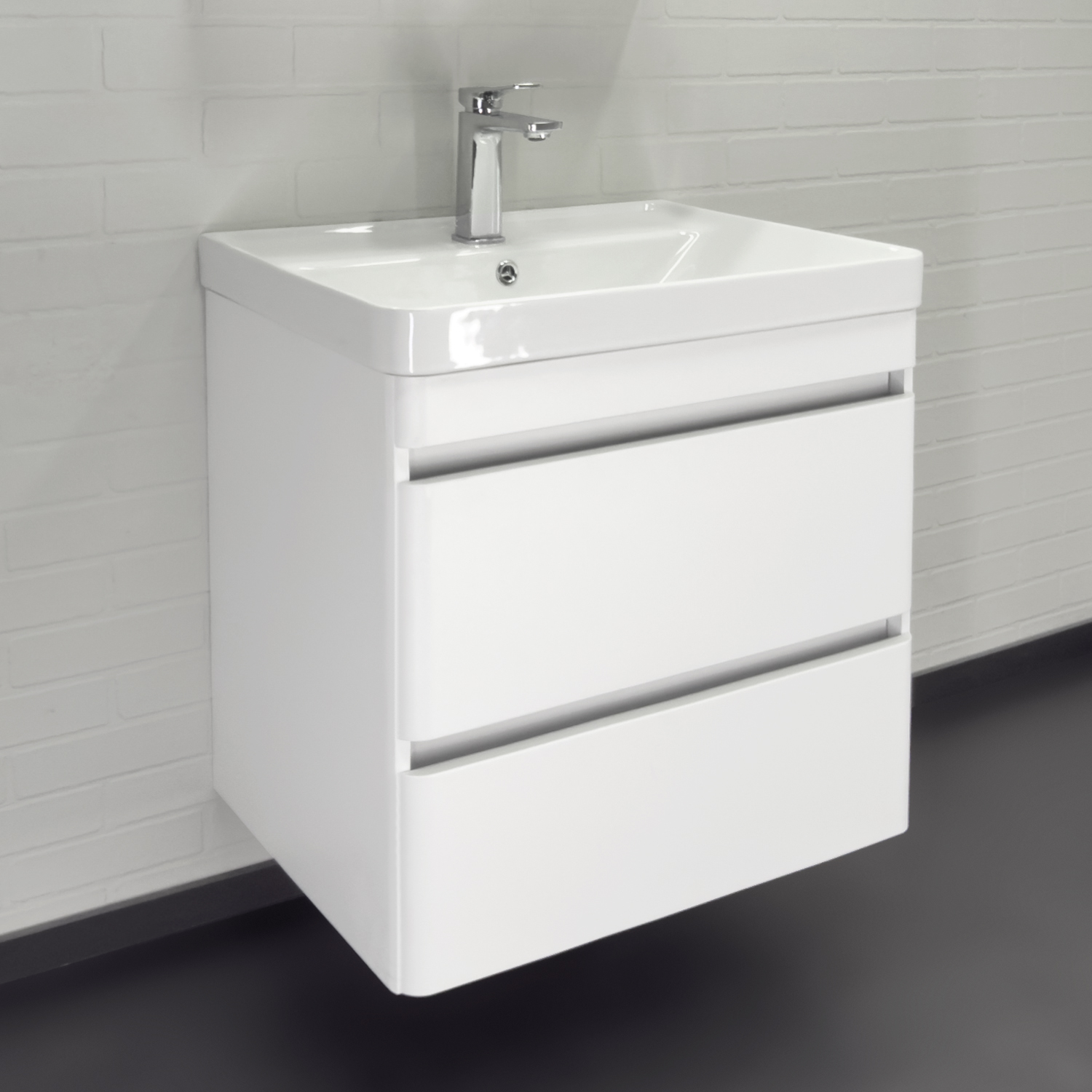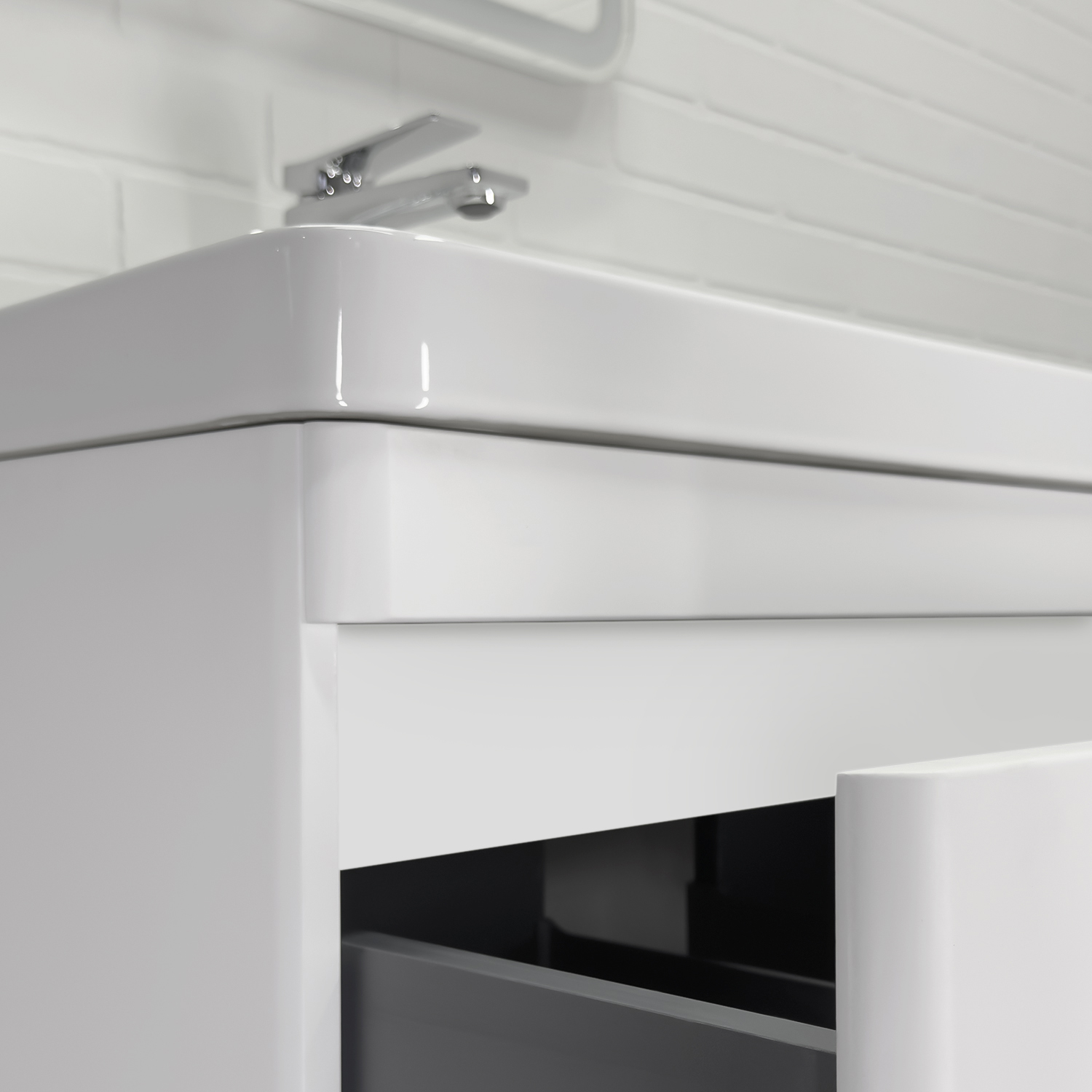 Подвесная тумба шириной 60 см с двумя выдвижными ящиками. Направляющие ящиков оборудованы системой плавного закрывания. Лицевая фурнитура на фасадах отсутствует, для открытия ящиков нужно потянуть верхний край фасада, на котором сделан вырез под естественный хват. Боковые края фасада закруглены под радиус 30 мм. Ящики выполнены из ВЛДСП контрастного цвета серый уголь. Тумба подготовлена для подключению коммуникаций снизу и сзади.