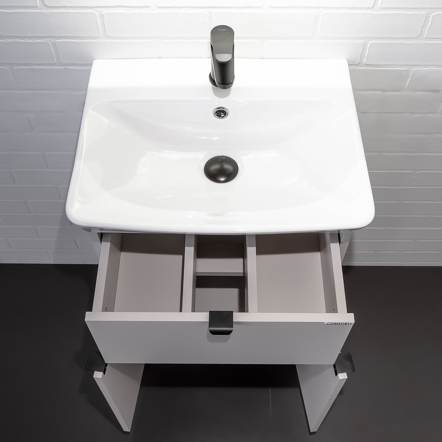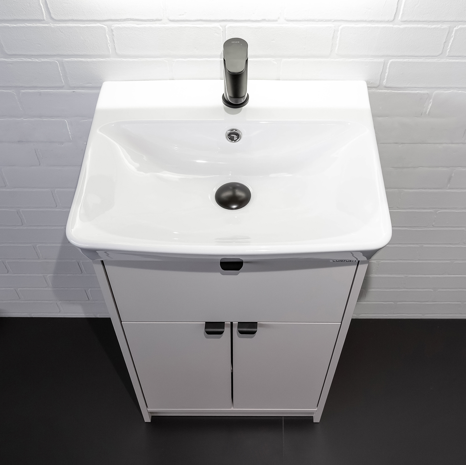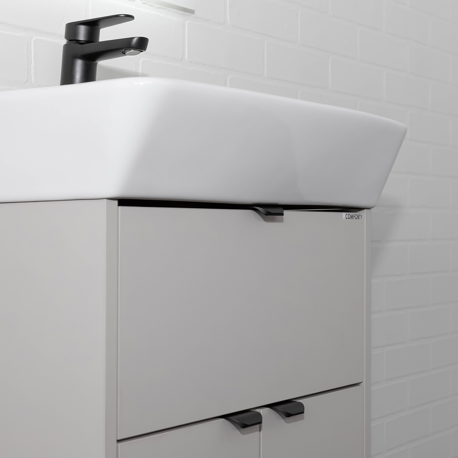 Раковина: Белоснежный санфарфор раковины Comforty 9055RA-50 обладает гладкой, устойчивой к бактериям беспористой структурой. Выступающий вперед фасад раковины и продуманные бортики максимально увеличивают внутреннее пространство чаши.
