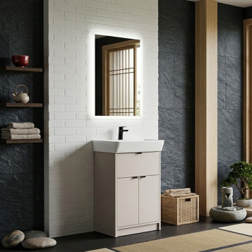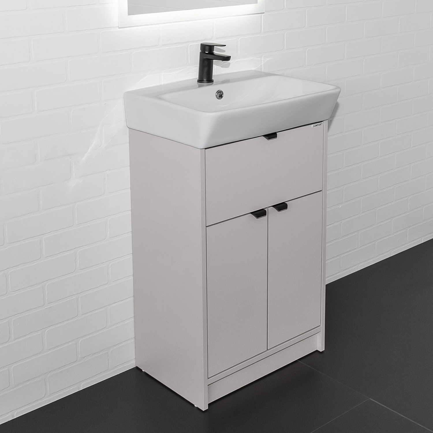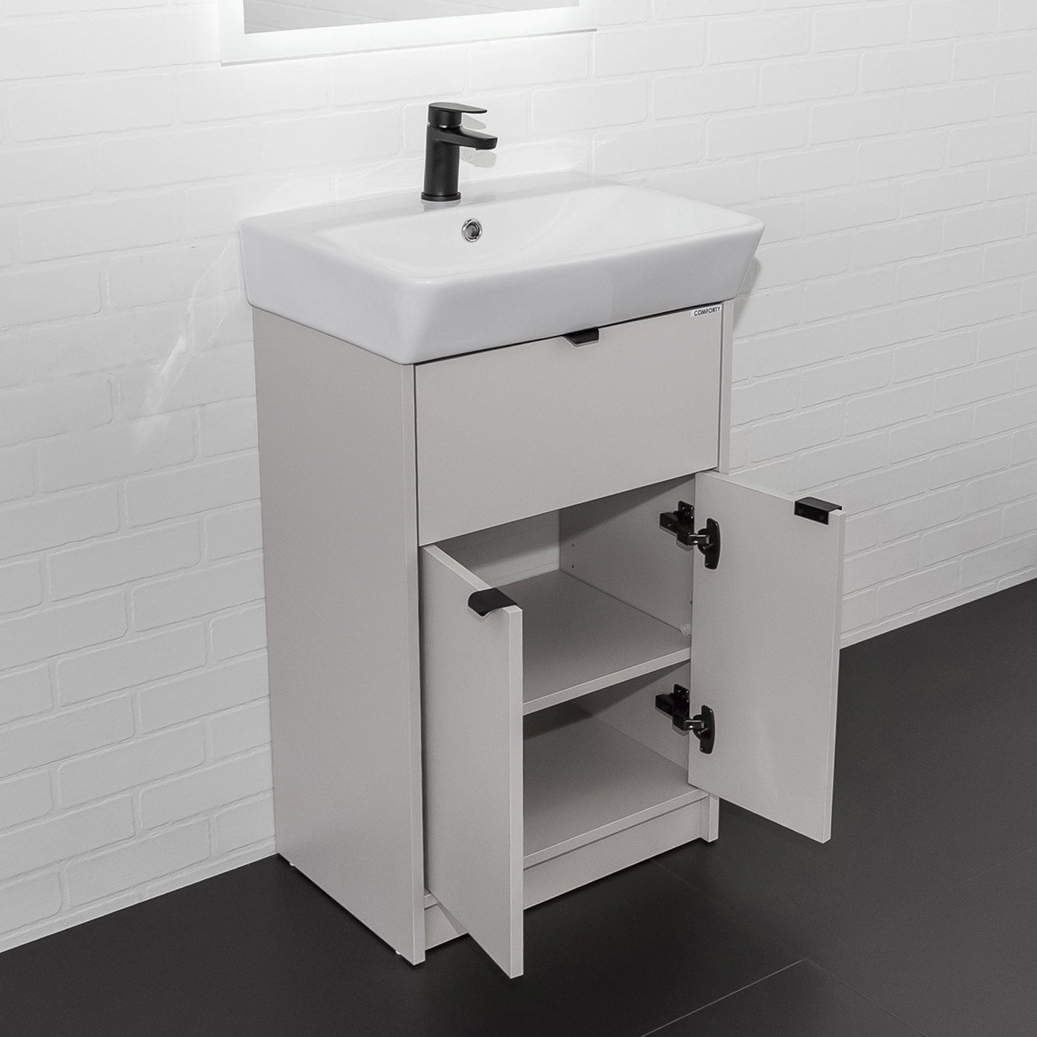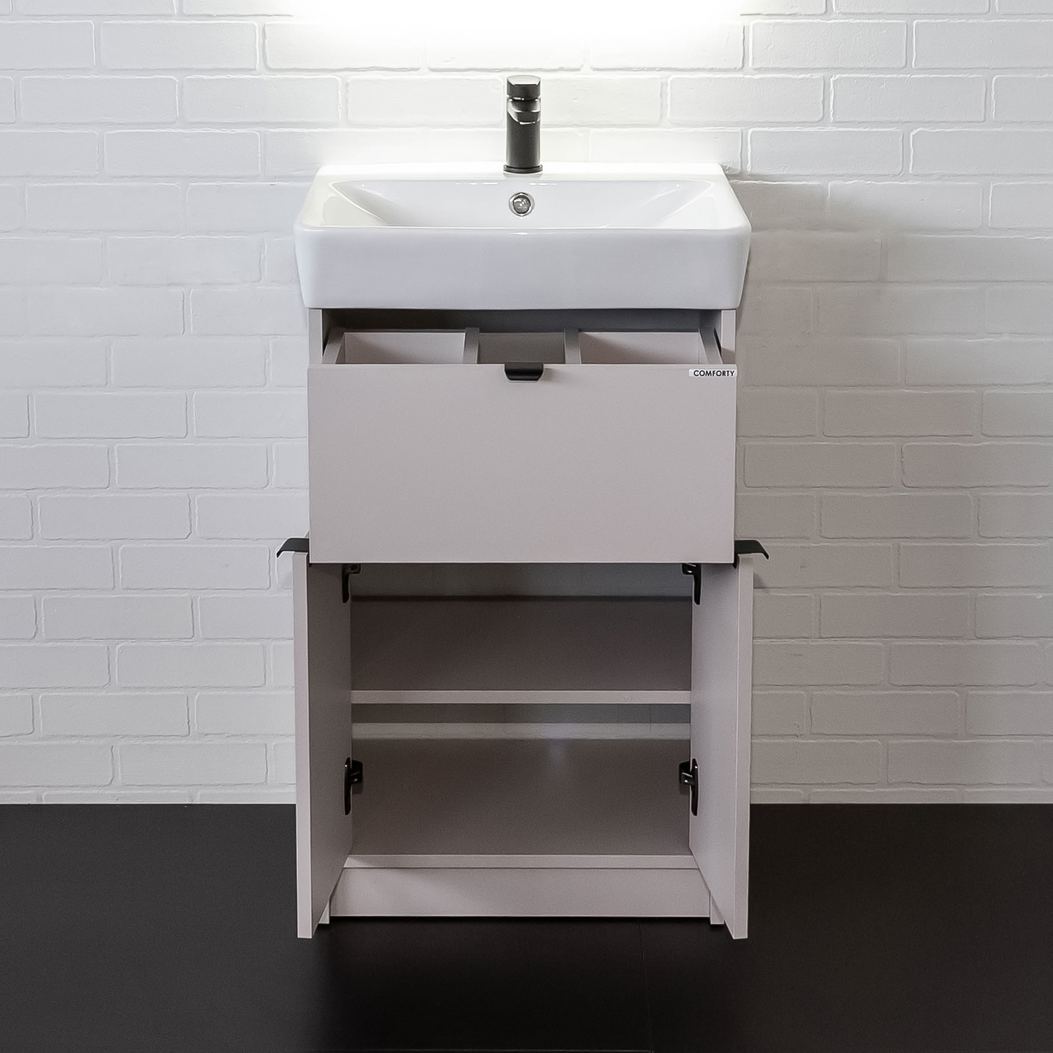 Компактная напольная тумба-умывальник шириной 50 см оснащена удобным верхним выкатным ящиком для хранения повседневных принадлежностей и вместительными нижним отделением.