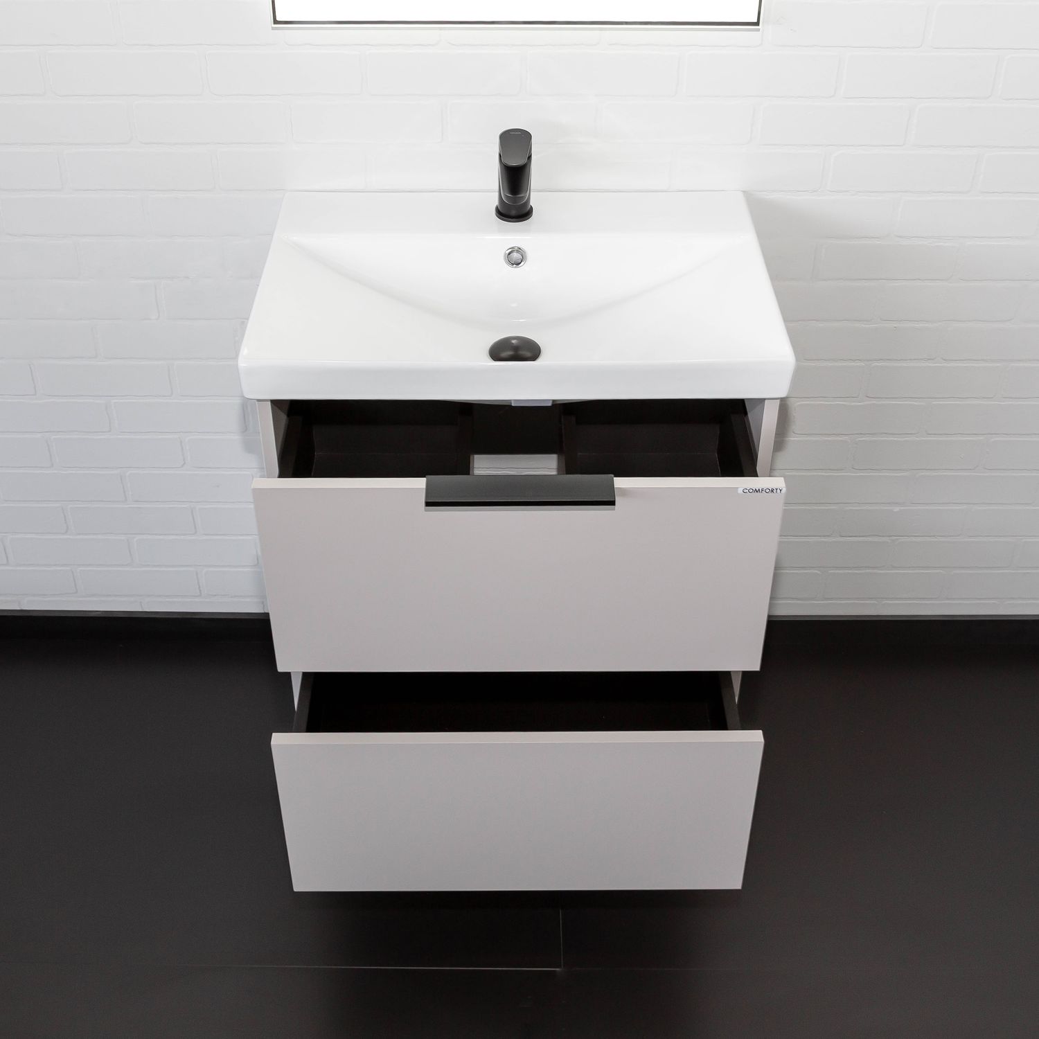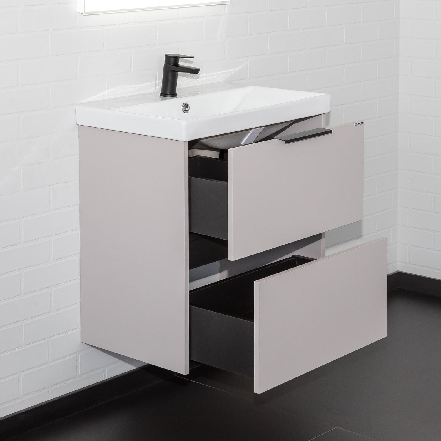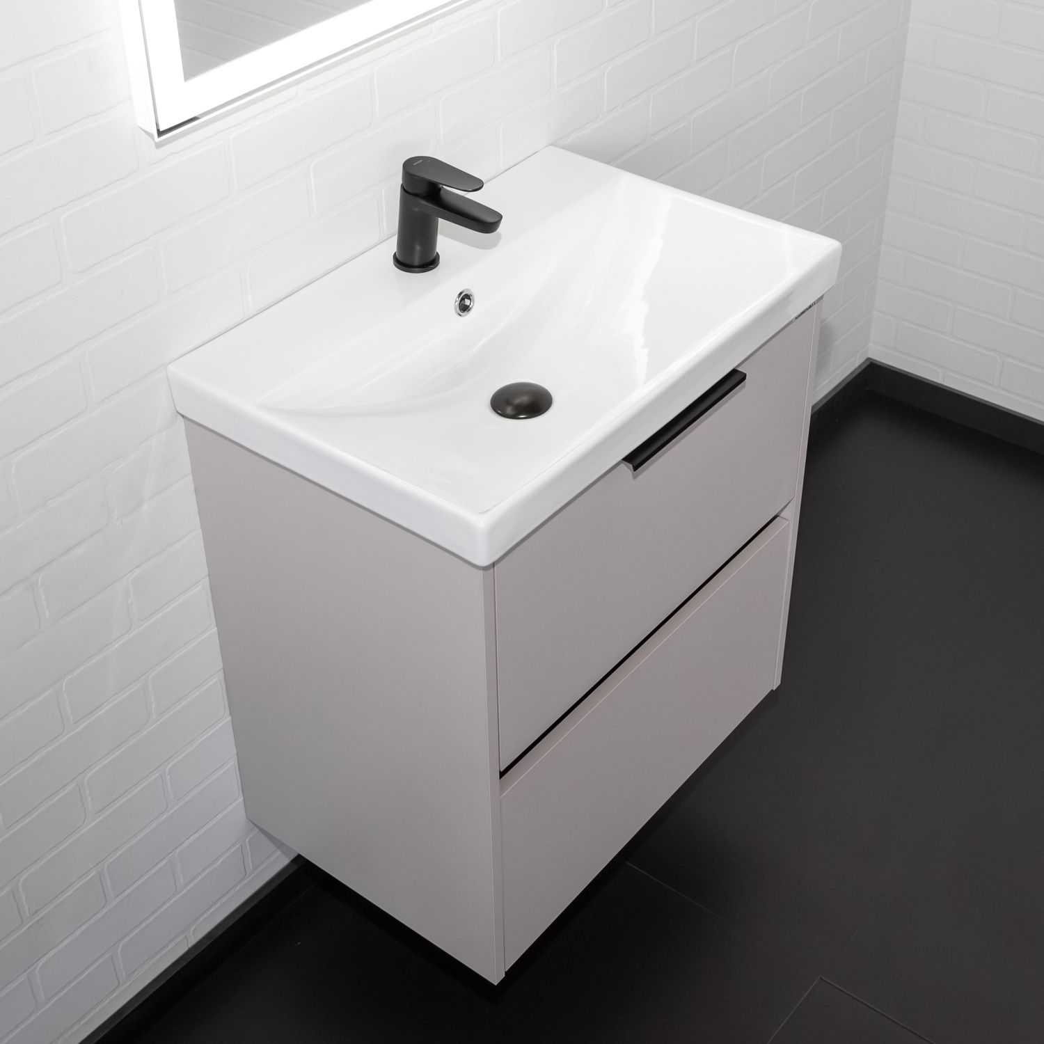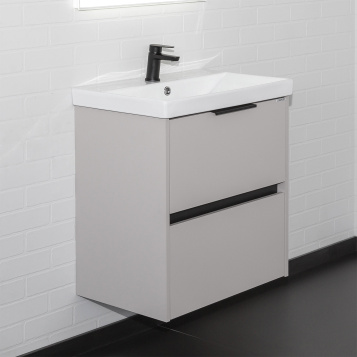 Подвесная тумба шириной 60 см с двумя вместительными выдвижными ящиками. Направляющие ящиков оборудованы системой плавного закрывания. Верхний ящик открывается черной профильной ручкой. Ручку устанавливать не обязательно. Верхний ящик можно открыть за нижний край фасада. Для открытия нижнего ящика нужно потянуть верхний край фасада. Ящики выполнены из ВЛДСП контрастного черного цвета. Тумба подготовлена для подключению коммуникаций снизу и сзади.