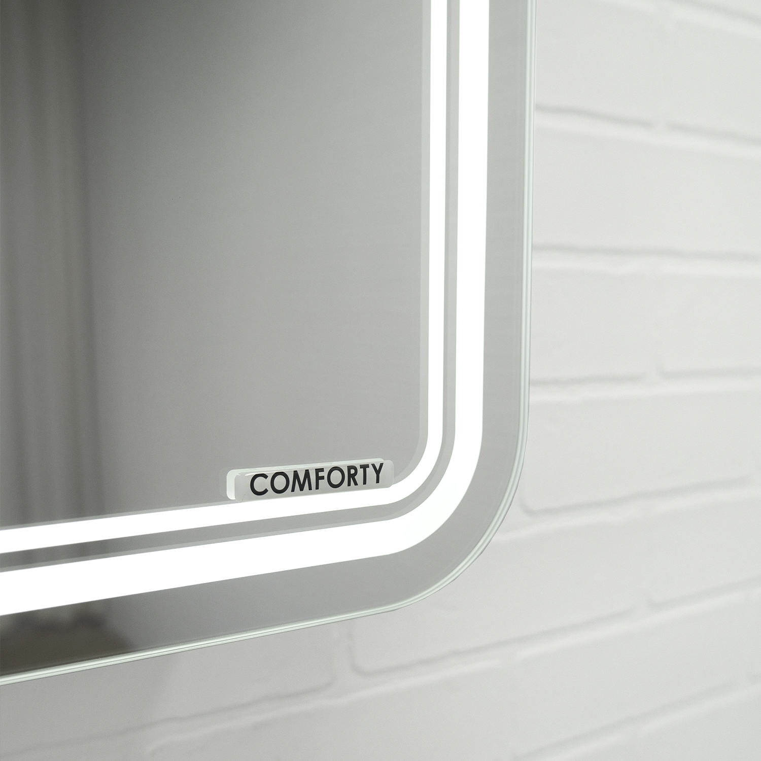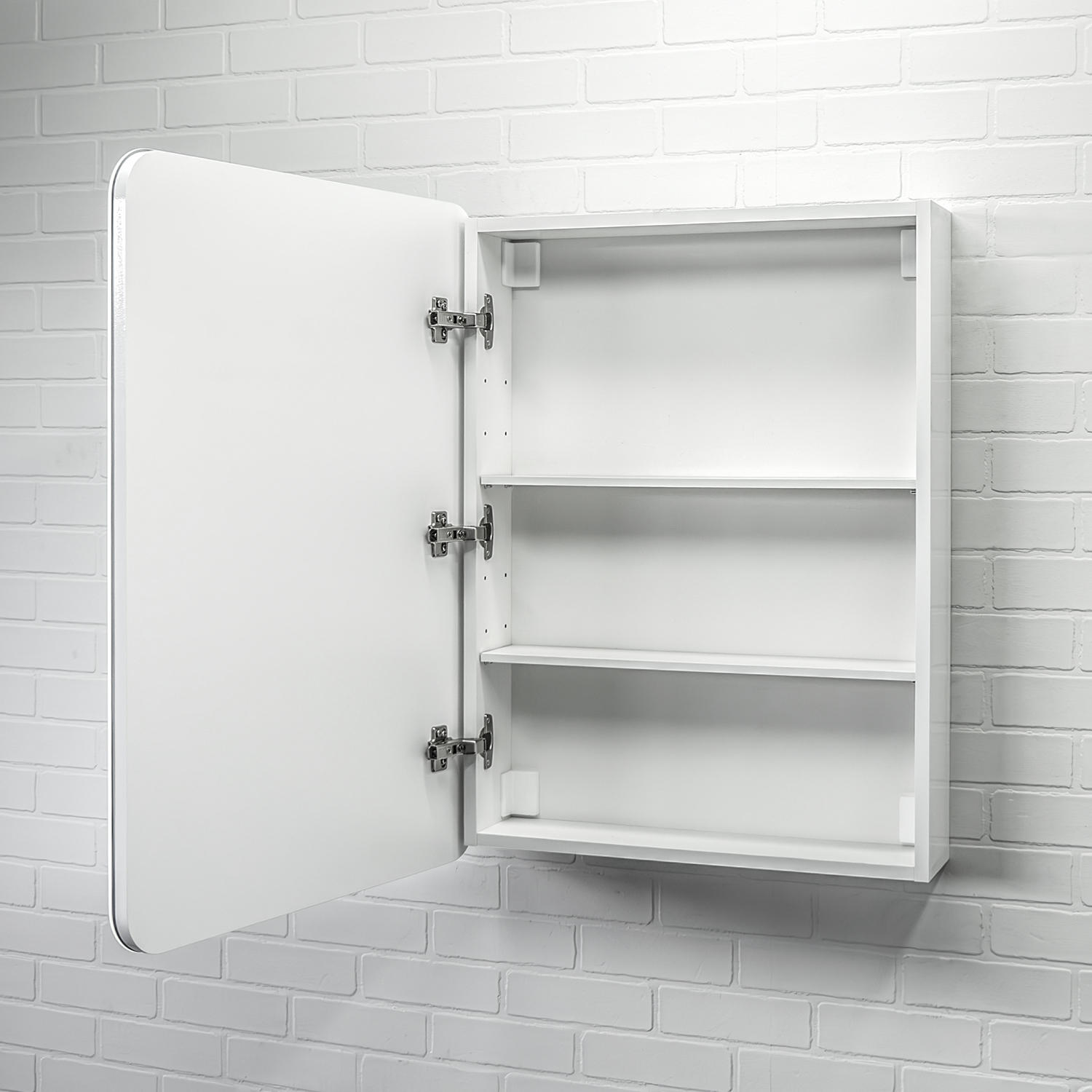 За створкой две горизонтальные полки. Петли у створки снаружи. Зеркало-шкаф универсально - может быть подвешено в правом и левом варианте. Контурная светодиодная подсветка с плотностью светодиодов 120 шт.м. Бесконтактный сенсорный выключатель с функцией диммирования (регулировка яркости от минимального до яркого.