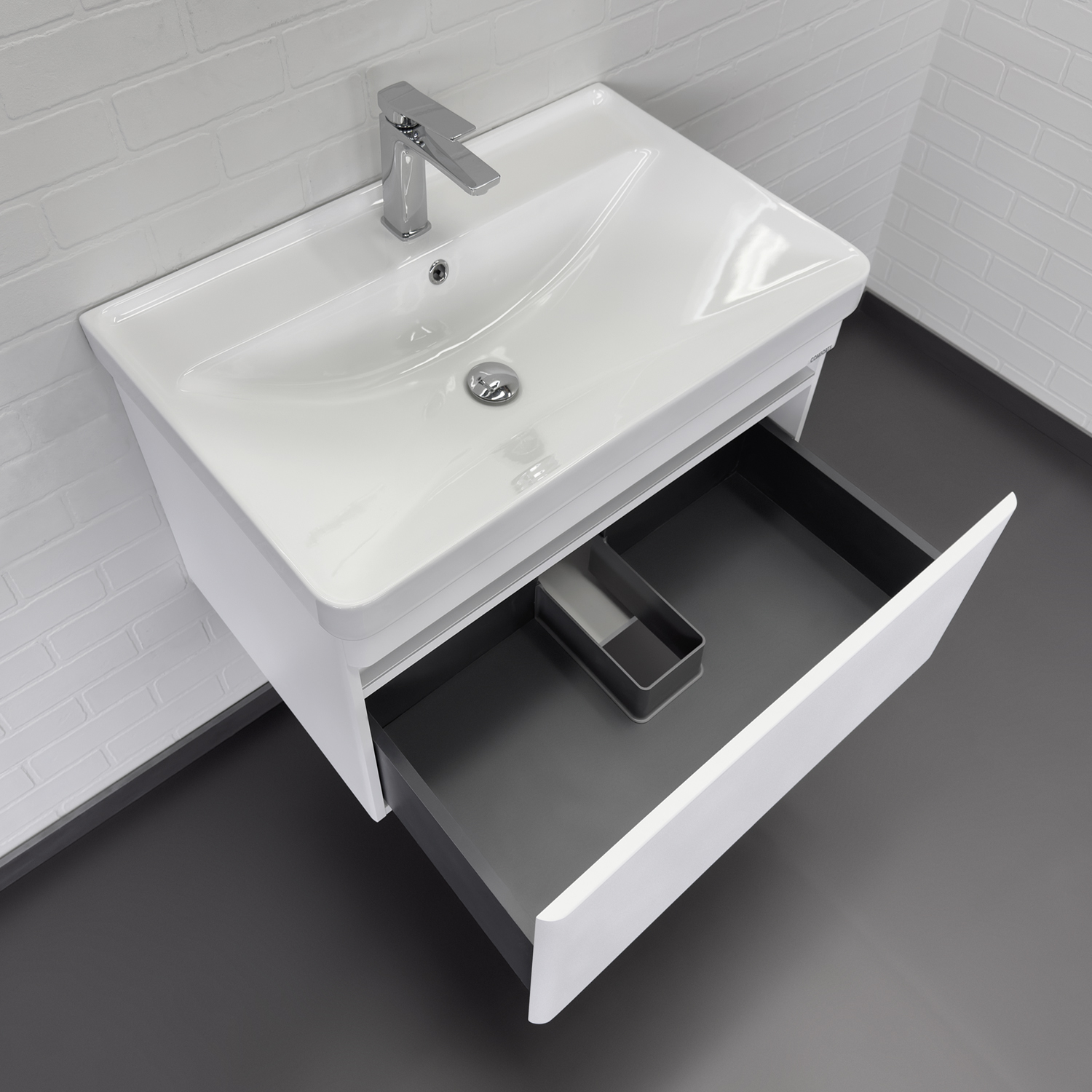 Направляющие ящика оборудованы системой плавного закрывания. Лицевая фурнитура на фасаде отсутствует, для открытия ящика нужно потянуть верхний край фасада, на котором сделан вырез под естественный хват. Прорезь в фасаде декорирована алюминиевым профилем. Ящик выполнен из ВЛДСП контрастного цвета "серый уголь". Тумба подготовлена для подключению коммуникаций снизу и сзади.