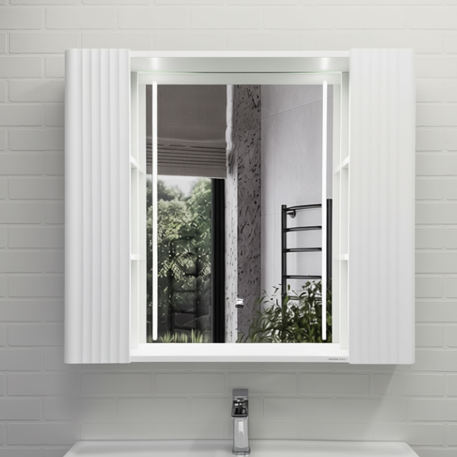 Зеркальное высококачественное полотно с амальгамой на основе серебра. Боковые фасадные панели декорированы вертикальной фрезеровкой. За каждой из боковых панелей по две полки доступ к которым осуществляется со стороны зеркала. В модели применяется декоративная плёнка с эффектом Soft-Touch с тиснением под текстуру дуба.