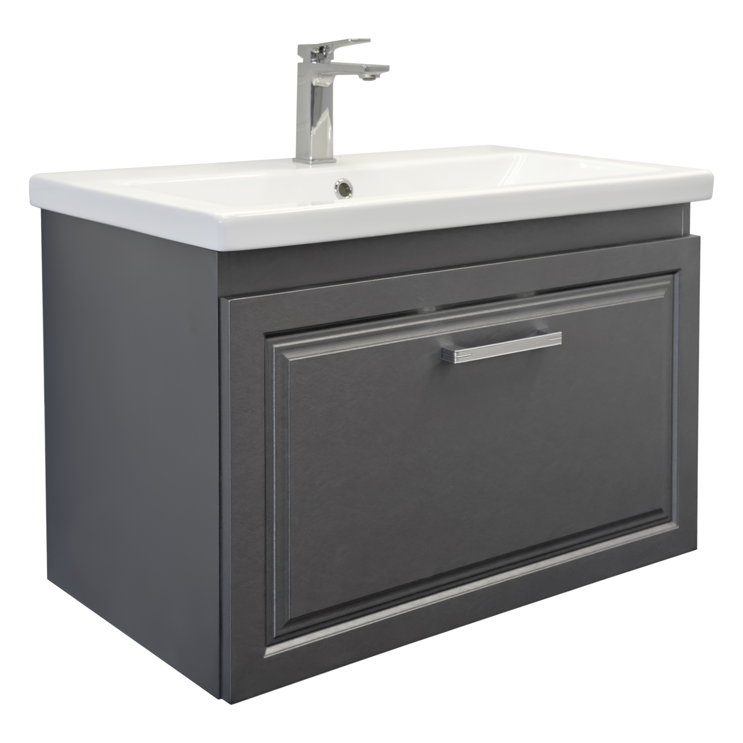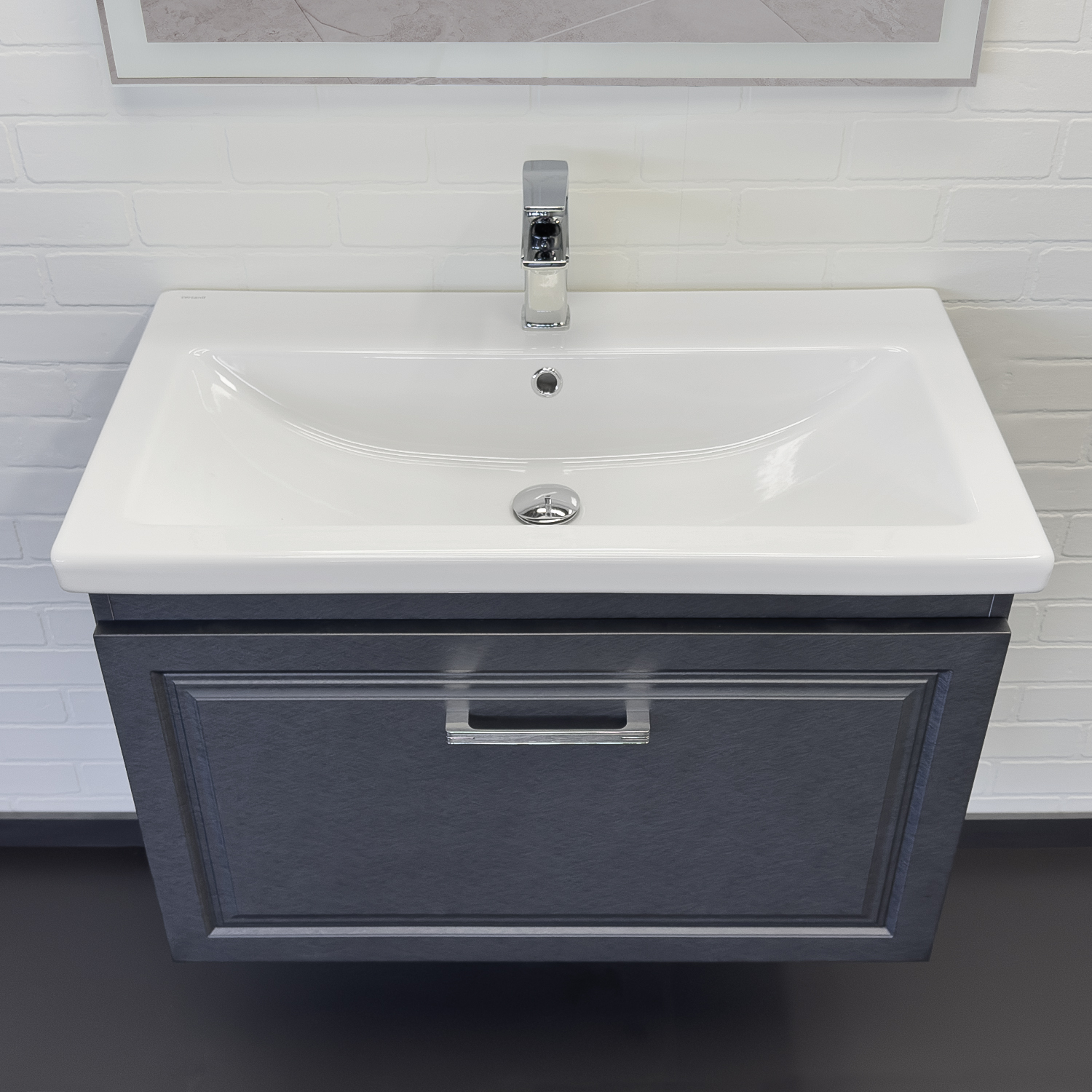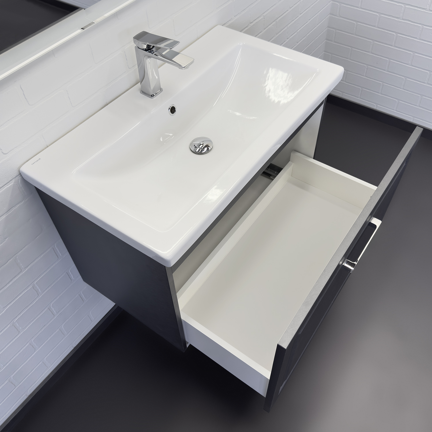 Подвесная тумба-умывальник шириной 80 см с одним выдвижным ящиком. Фасад ящика декорированы фрезеровкой по контуру. Ящик оснащен направляющими с механизмом плавного закрывания. В модели применяется матовая плёнка цвета оружейная сталь с эффектом браширования. Тумба подготовлена для подключения коммуникаций сзади и снизу.