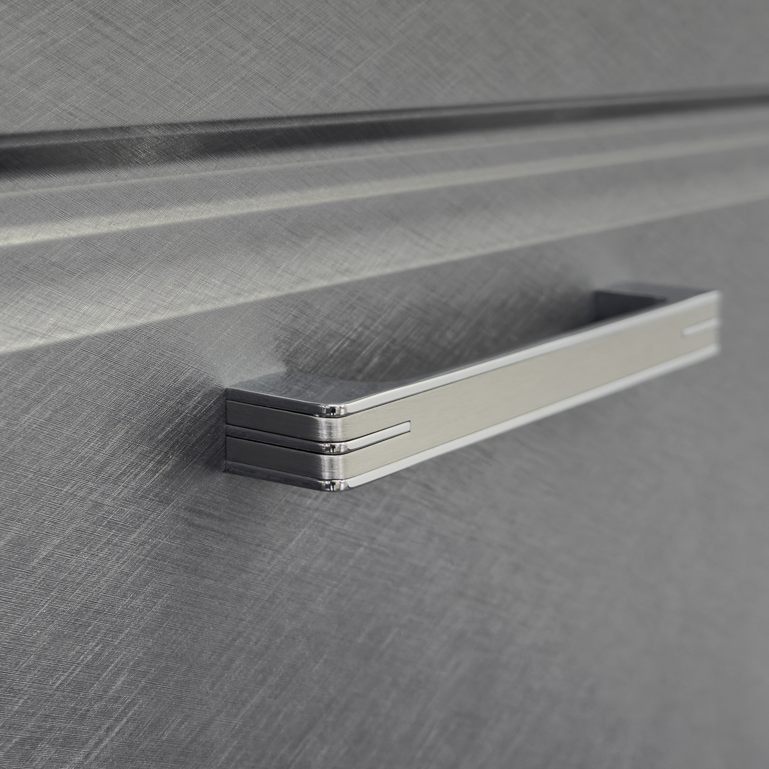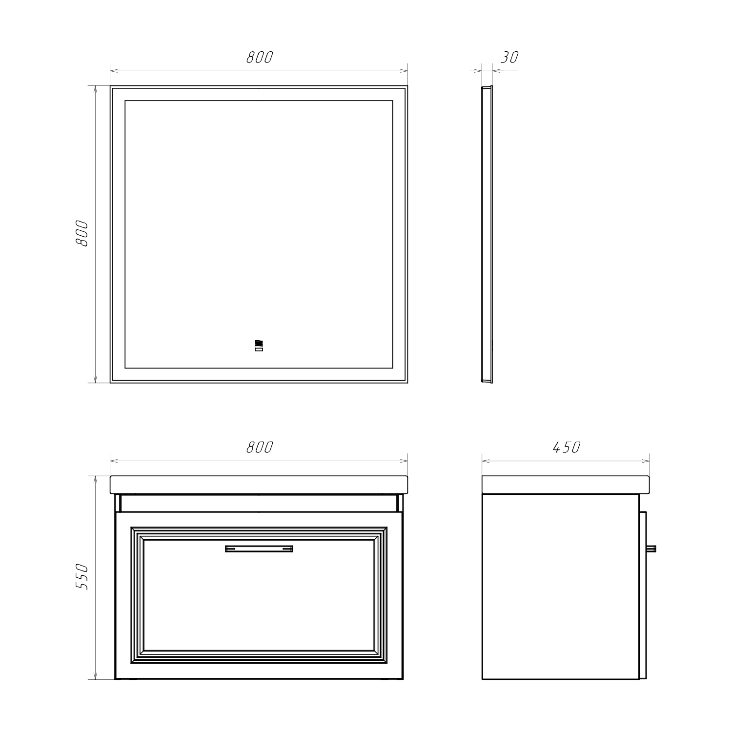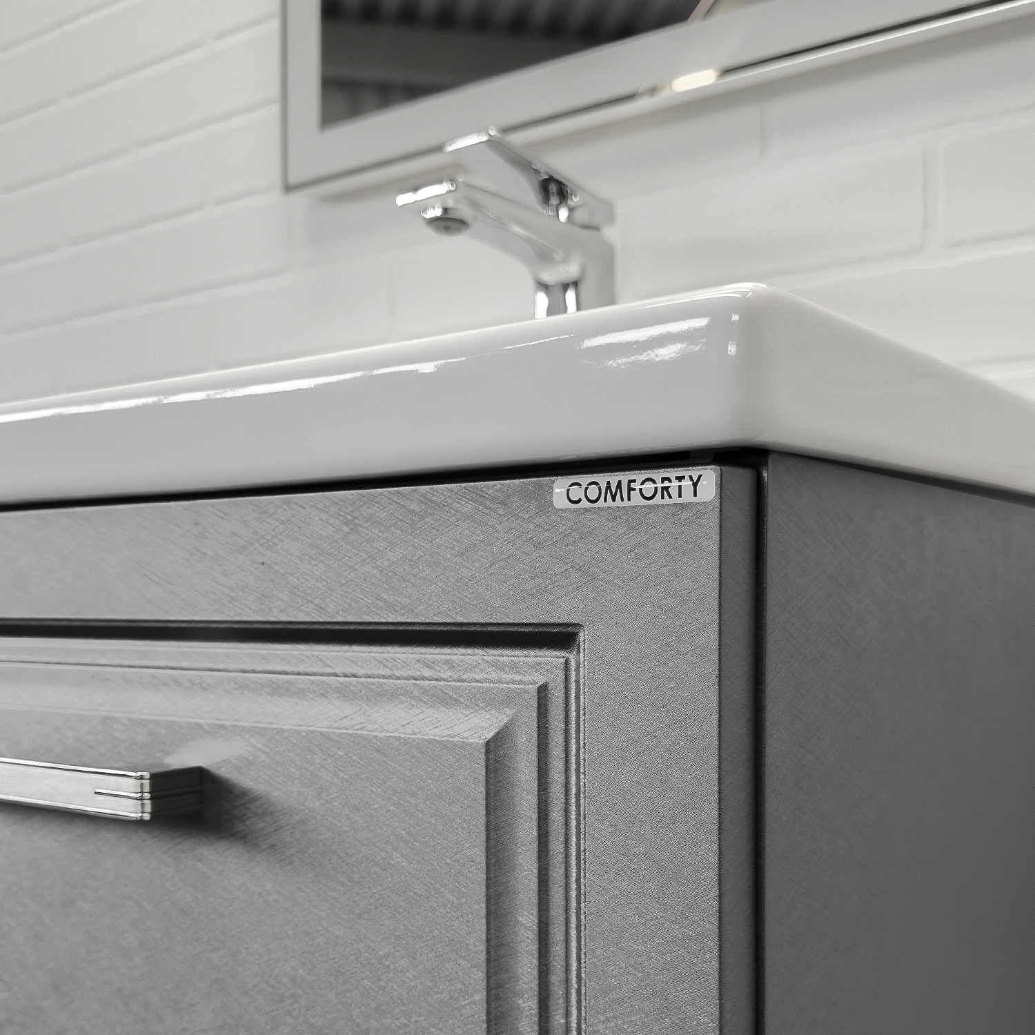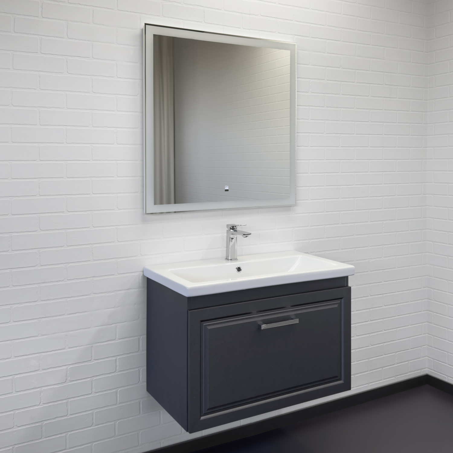 Подвесная тумба-умывальник шириной 80 см с одним выдвижным ящиком. Фасад ящика декорированы фрезеровкой по контуру. Ящик оснащен направляющими с механизмом плавного закрывания. В модели применяется матовая плёнка цвета оружейная сталь с эффектом браширования. Тумба подготовлена для подключения коммуникаций сзади и снизу.