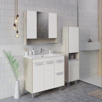 Напольная тумба-умывальник с двумя створками и двумя ящиками оснащенными системой плавного закрывания. Фасады с горизонтальной фрезеровкой окрашены белой матовой эмалью. Боковины тумбы из влагостойкого ЛДСП - дуб дымчатый.
