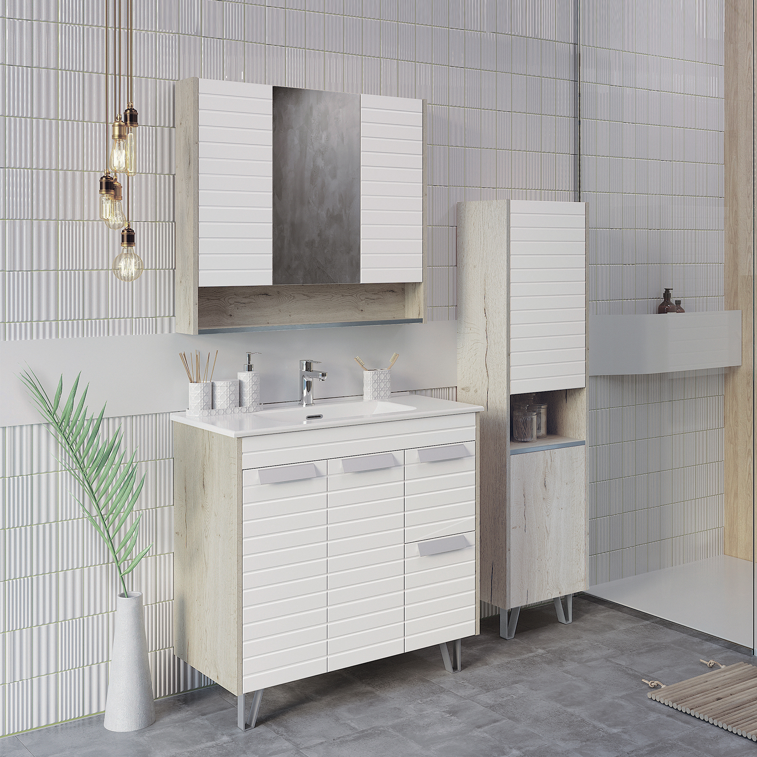 Шкаф-колонна отличное решение для хранения разных предметов необходимых в ванной комнате. Напольная шкаф-колонна с двумя створками. Верхняя створка оснащена петлями с плавным закрыванием. Верхний фасад колонны окрашен белой матовой эмалью и декорирован фрезеровкой горизонтальными полосами. Нижний фасад из влагостойкого ЛДСП дуб дымчатый оборудован системой push-to-open. За верхней створкой две горизонтальные полки, за нижней одна. Колонна оснащена декоративными ножками в одном стиле ножками тумбы-умывальника.