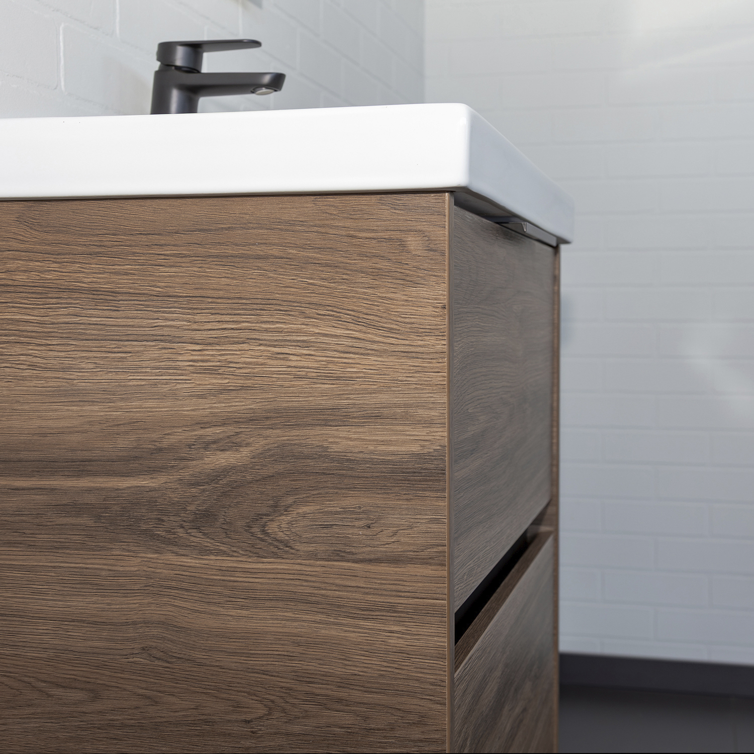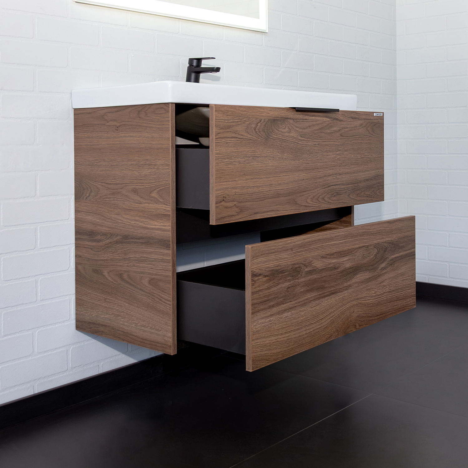 Подвесная тумба шириной 80 см с двумя вместительными выдвижными ящиками. Направляющие ящиков оборудованы системой плавного закрывания. Верхний ящик открывается черной профильной ручкой. Для открытия нижнего ящика нужно потянуть верхний край фасада. Ящики выполнены из ВЛДСП контрастного серого цвета. Тумба подготовлена для подключению коммуникаций снизу и сзади.