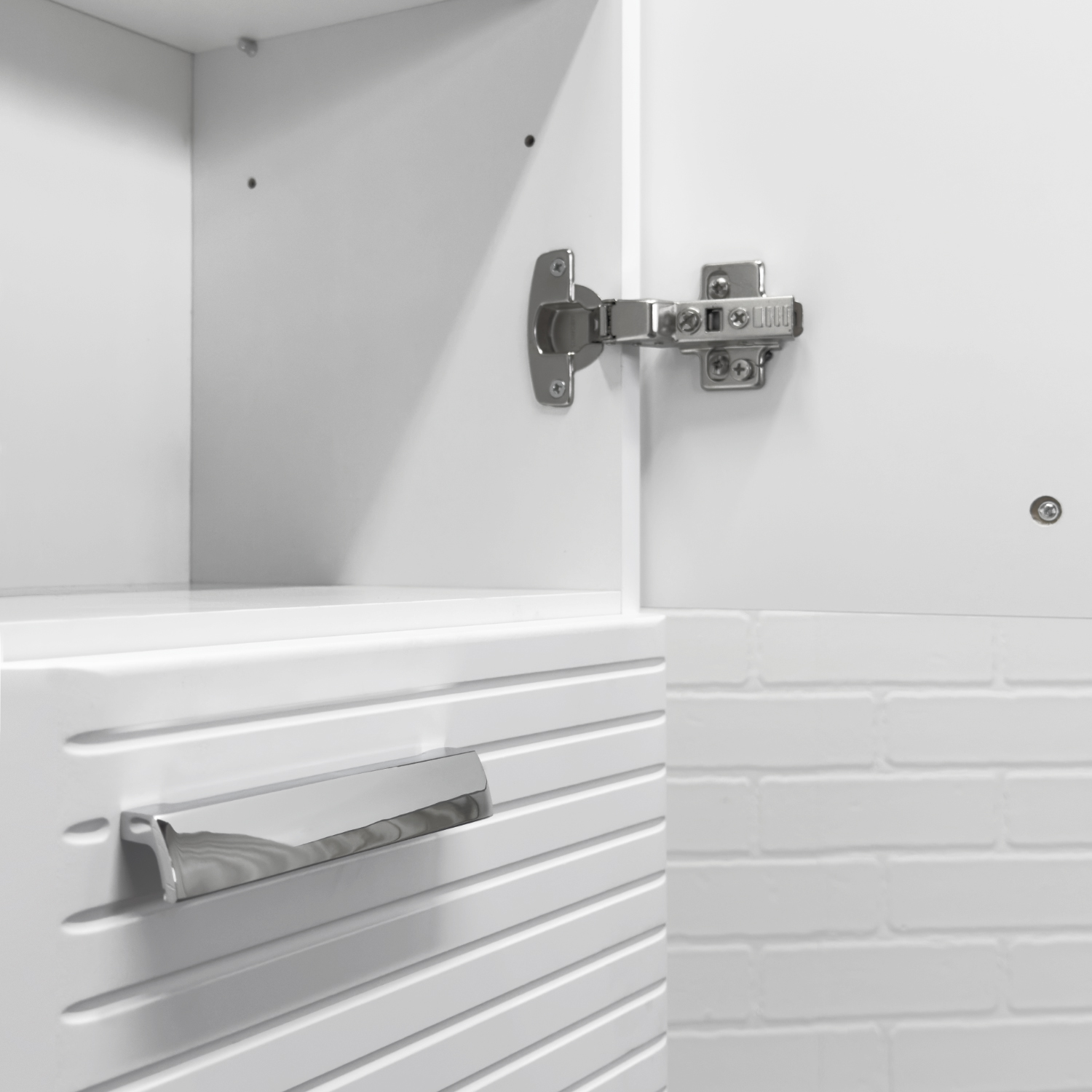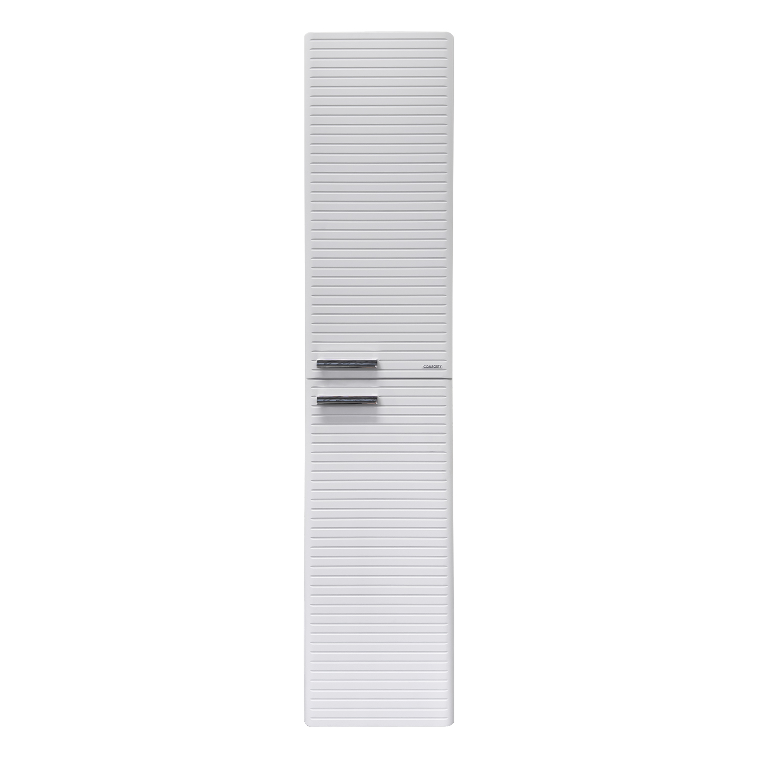 Подвесная шкаф-колонна отличное решение для хранения разных предметов необходимых в ванной комнате. Фасад створок декорированы горизонтальной линейной фрезеровкой. Боковые стенки и фасады пенала облицованы белой матовой пленкой с эффектом SoftTouch. Оригинальные эргономичные ручки цвета хром. За верхней дверцей и нижней створками по две регулируемые полки. Петли оборудованы механизмами плавного закрывания.