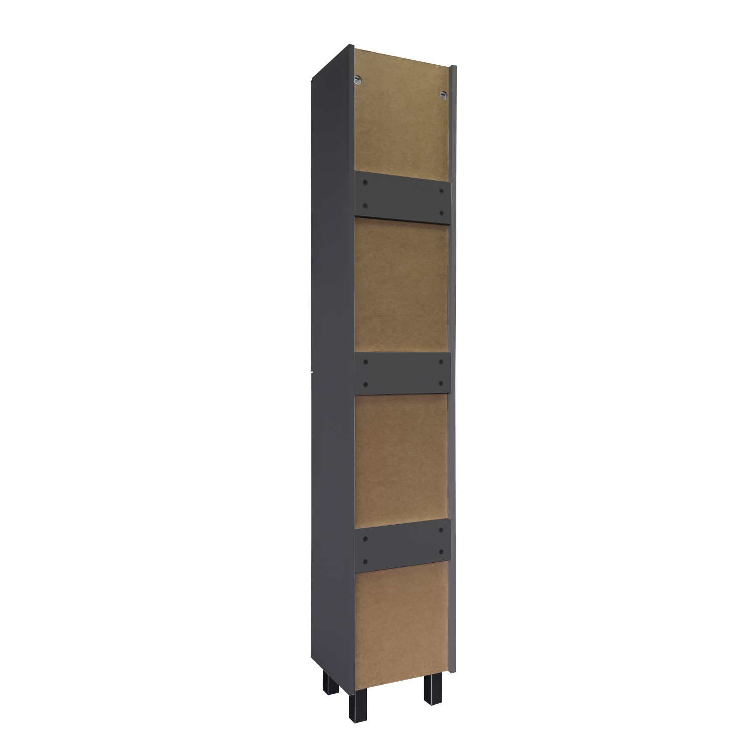 Напольная шкаф-колонна отличное решение для хранения разных предметов необходимых в ванной комнате. За верхней и нижней створками по три полки. Фасады изготовлены из МДФ декорированы вертикальной фрезеровкой и обтянуты в матовую пленку цвета антрацит с бархатистой поверхностью. Дверцы могут быть подвешены как в правом, там и в левом исполнении. Петли оборудованы механизмами плавного закрывания.