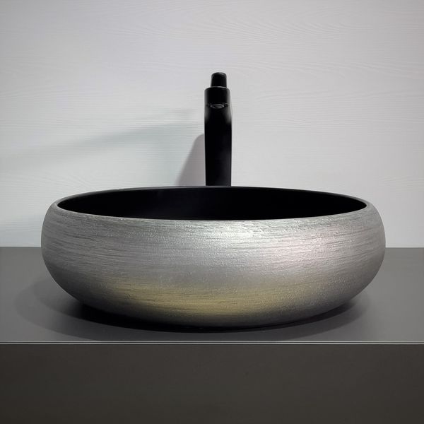 Раковина двухцветная. Внешняя поверхность окрашена глазурью имитирующей цвет серебра, внутренняя поверхность чаши черная матовая.