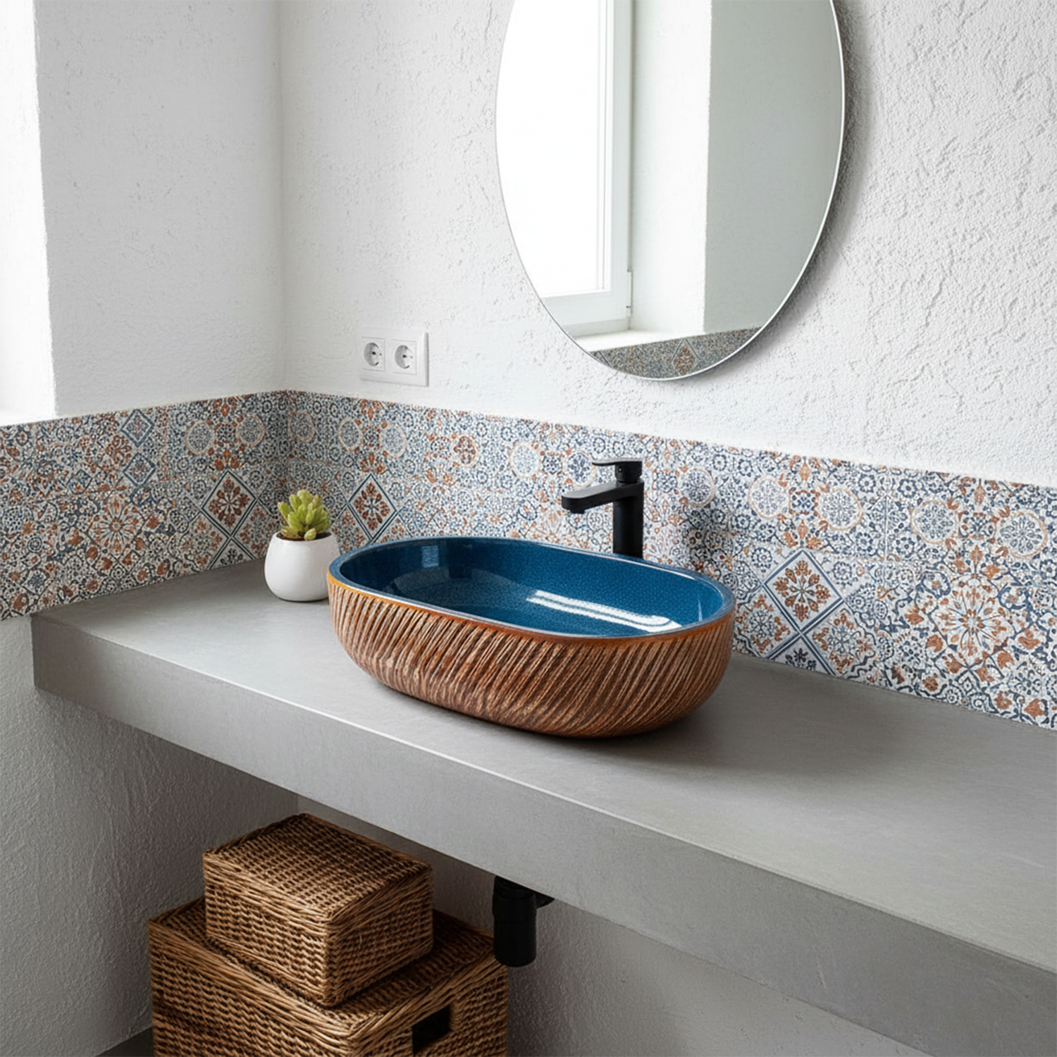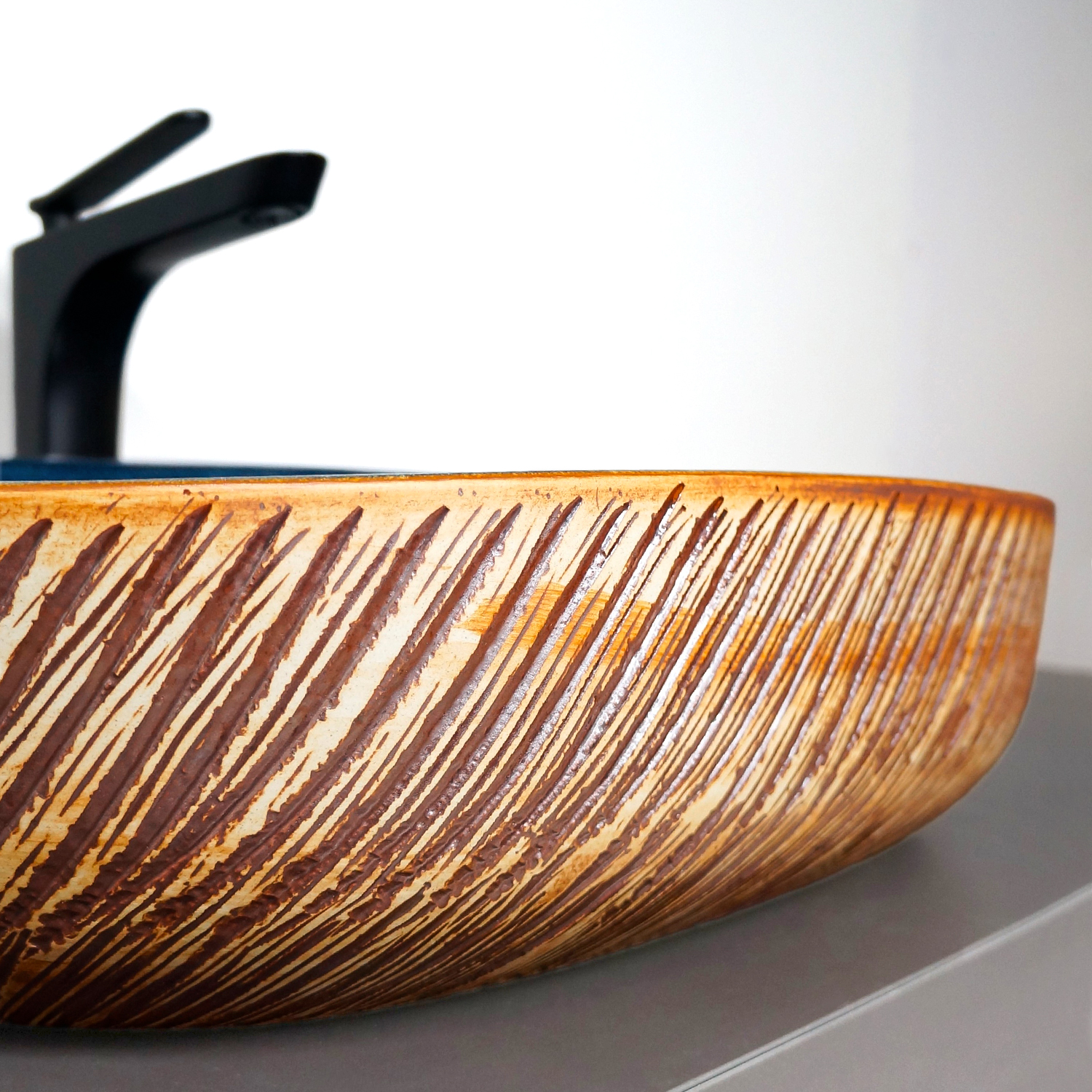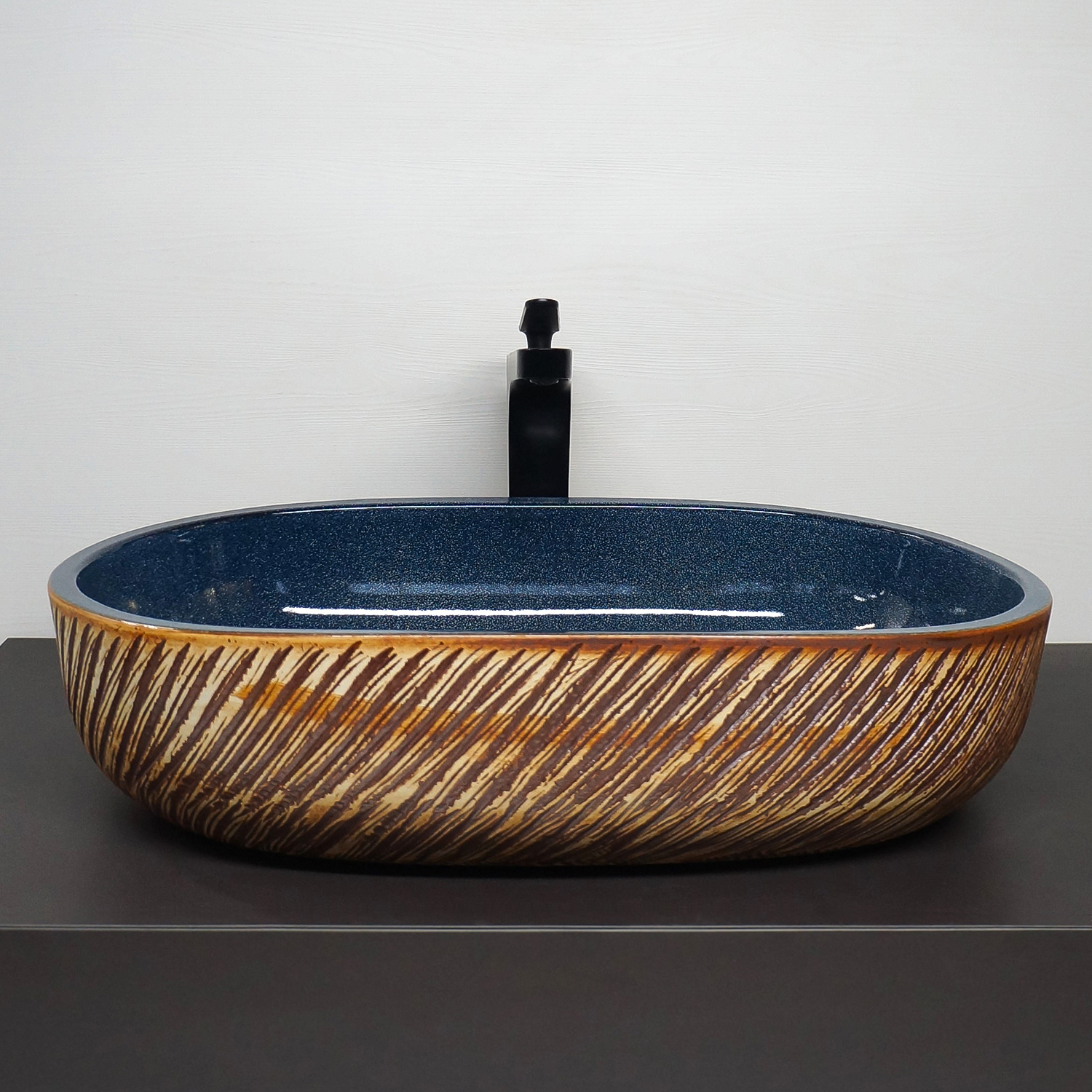 Глубокий янтарно‑синий цвет и глянцевая поверхность фарфора создают игру света и делают раковину выразительным элементом интерьерной композиции.