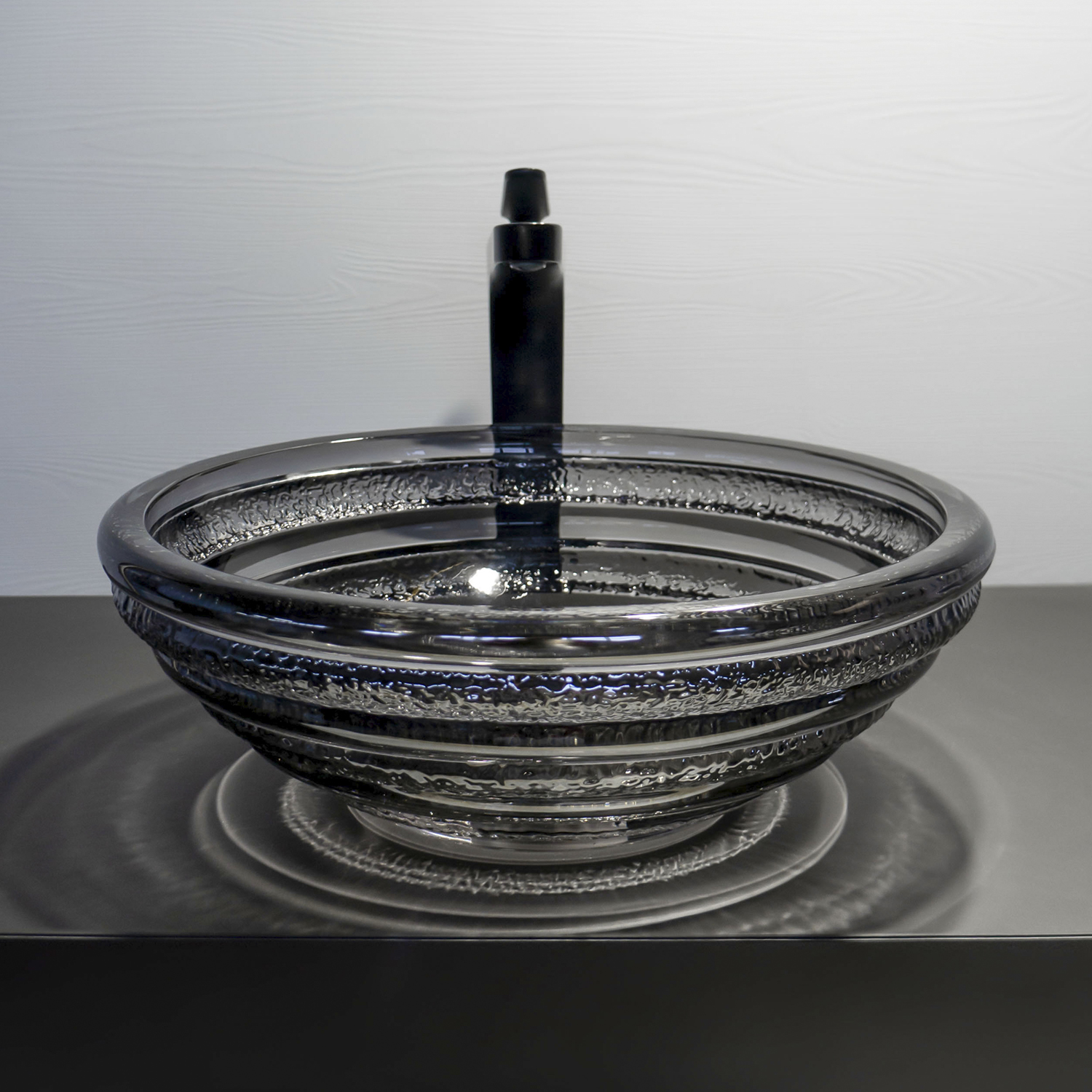 Круглая форма и объёмные фактурные полосы создают игру света и визуальную глубину, благодаря чему раковина смотрится легкой и одновременно солидной. Нейтральный серо-прозрачный оттенок органично сочетается с любыми цветами плитки и мебели — от белых минималистичных интерьеров до лофта и темных ванн.