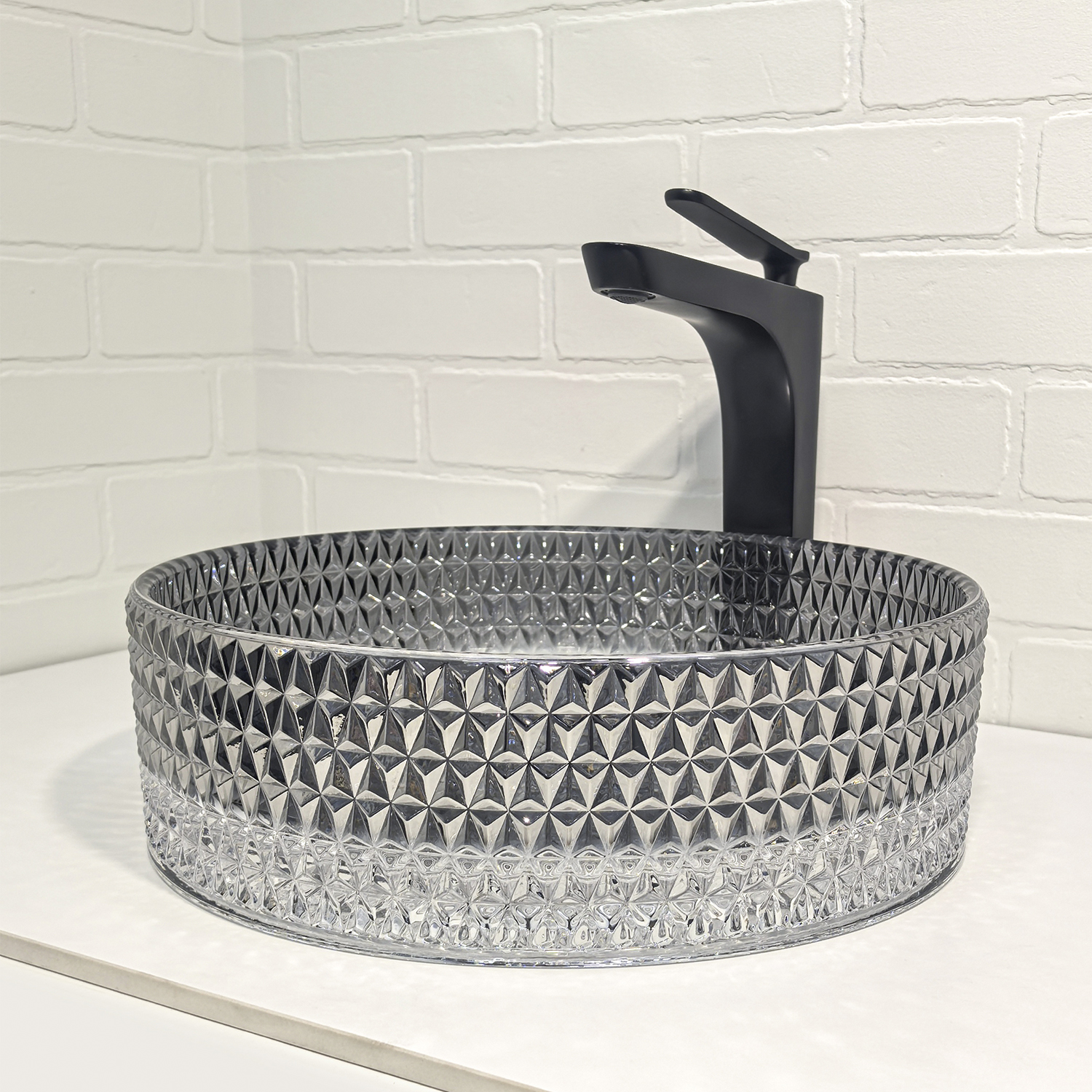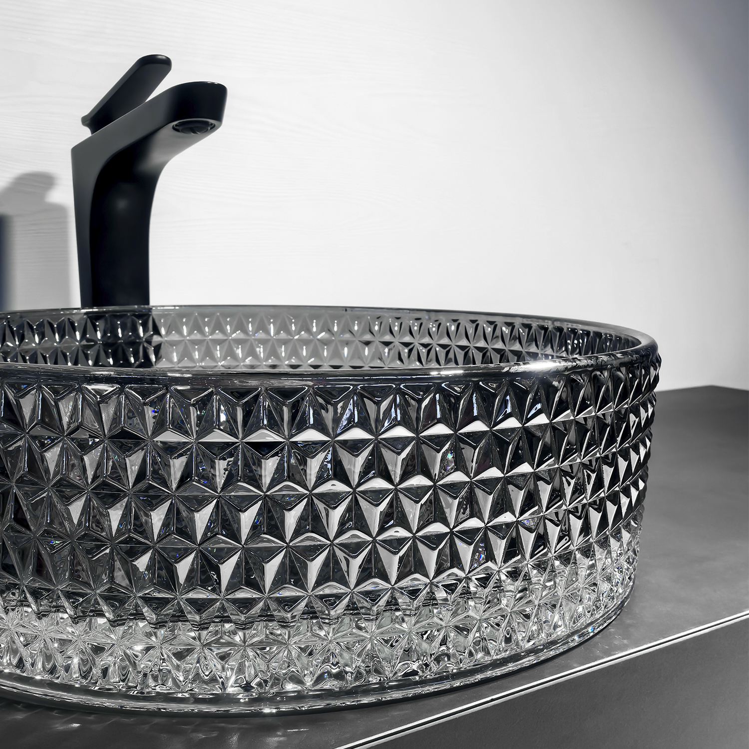 Раковина выполнена из закалённого стекла высокой прочности, устойчивого к ударам, перепадам температуры и бытовой химии, поэтому сохраняет безупречный вид многие годы. Гладкая внутренняя поверхность легко очищается, а фактурное гранёное внешнее оформление красиво играет светом и не оставляет равнодушными гостей.