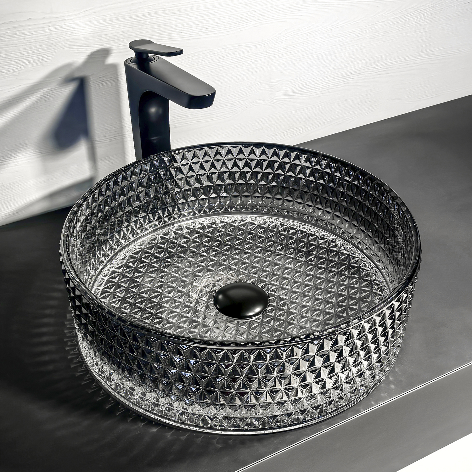 Градиентный серый оттенок от прозрачного дна к более насыщенному бортику создаёт эффект глубины и визуально «подсвечивает» воду, органично сочетаясь как с белой сантехникой, так и с тёмной мебелью.