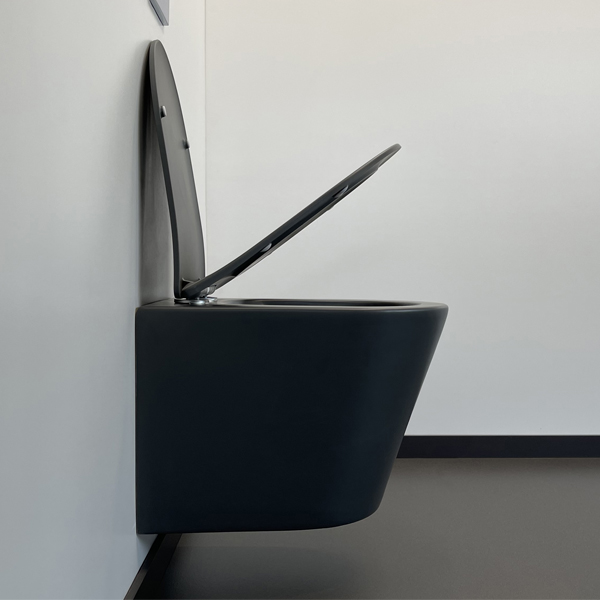 Безободковый подвесной унитаз Comforty 105MDH графит матовый с антибактериальной легкосъемной крышкой-сиденьем с функцией плавного закрывания. Безободковая конструкция чаши обеспечивает высочайший уровень гигиены и удобство в уборке из-за отсутствия труднодоступных мест.