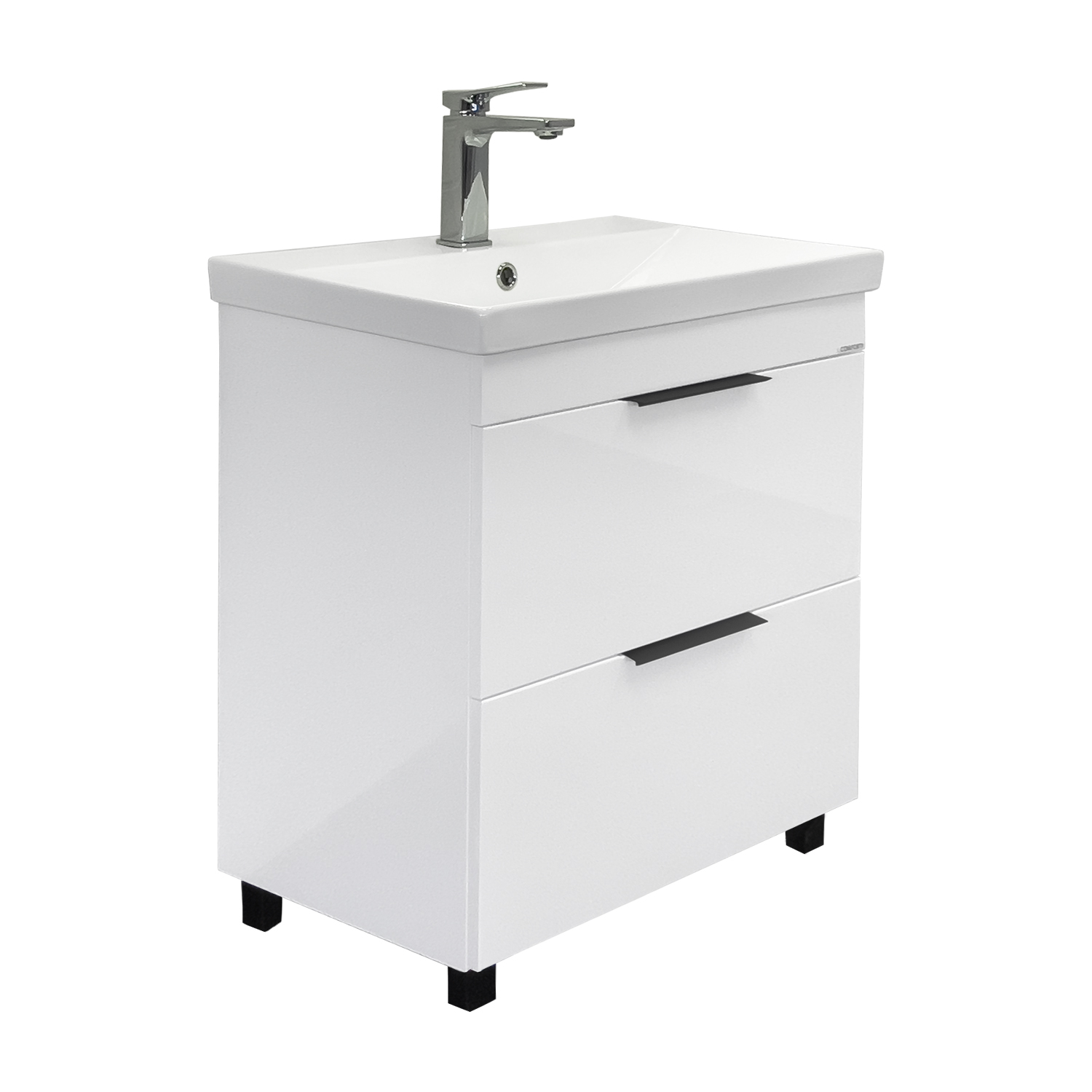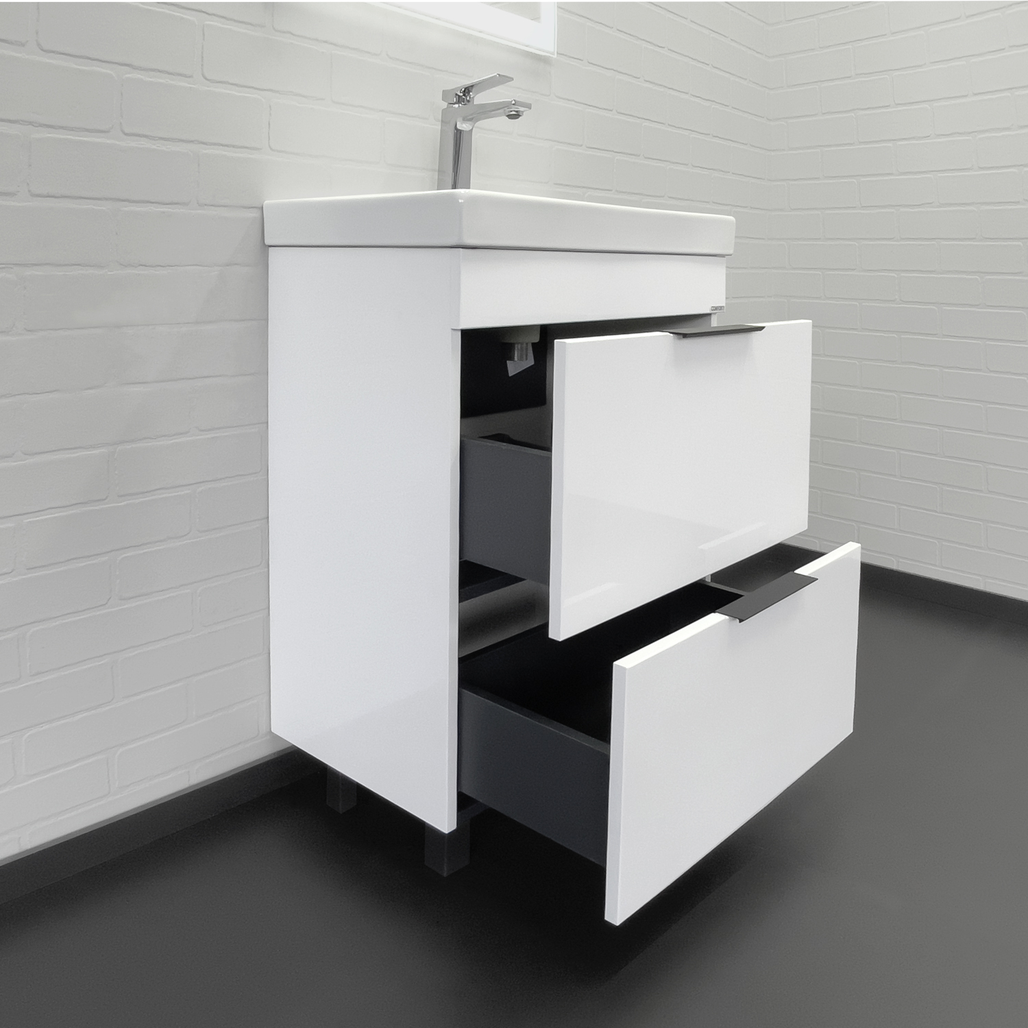 Напольная тумба Кама-60Н оснащена двумя выкатными ящиками и чёрными матовыми ножками, что дает много места для хранения и придает устойчивость тумбе.