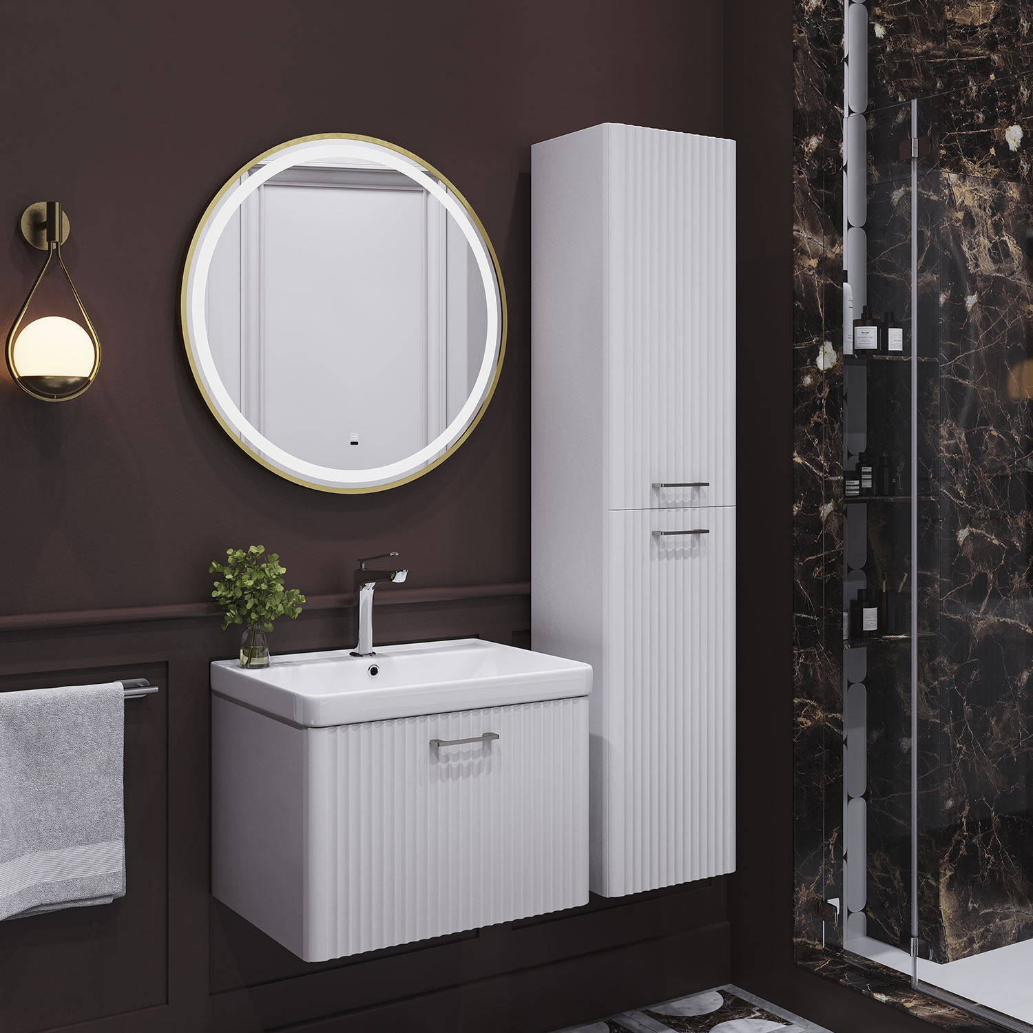 Корпуса выполнены из влагостойкого ЛДСП, фасады — из МДФ с качественной отделкой, что обеспечивает стойкость к влажности и долговечность мебели.