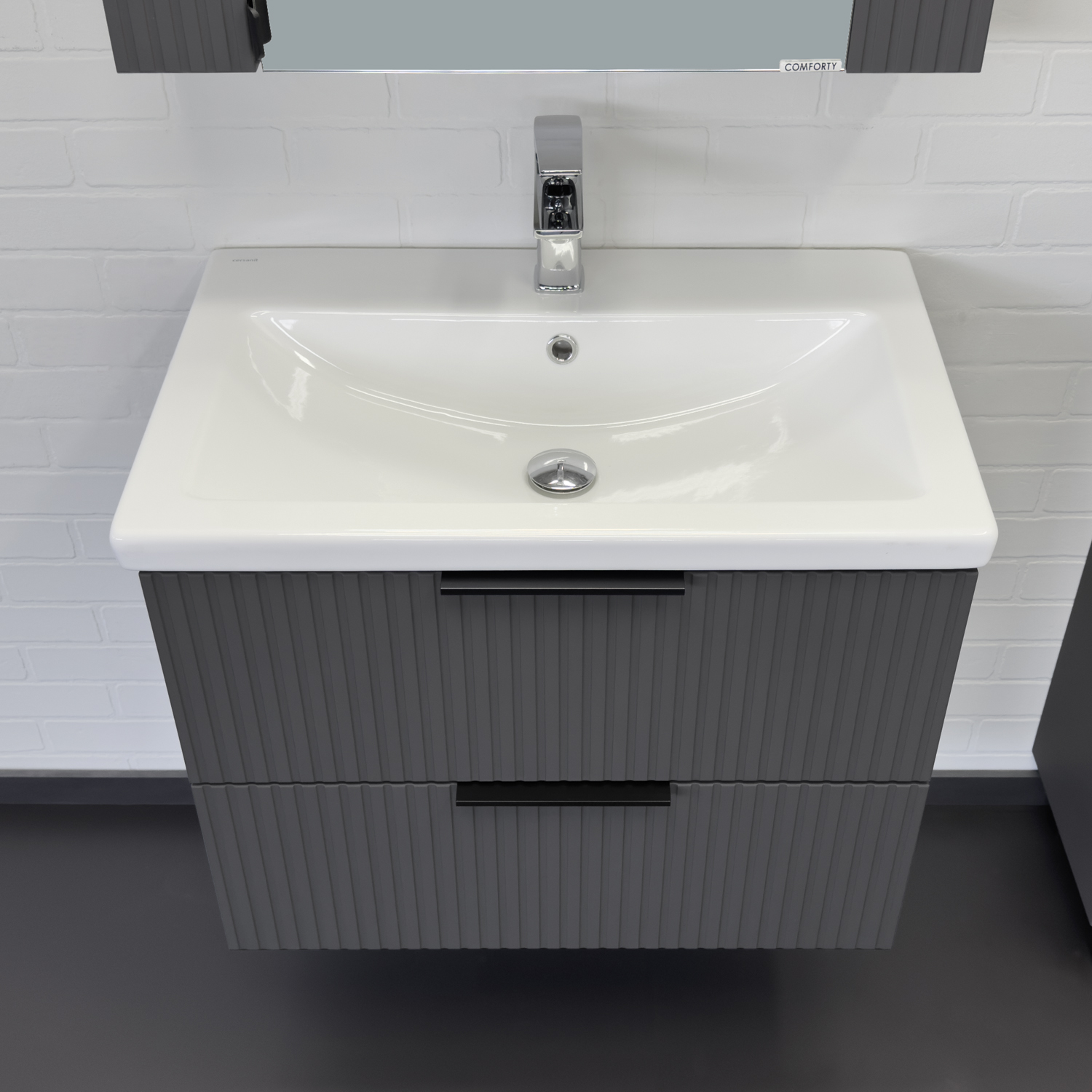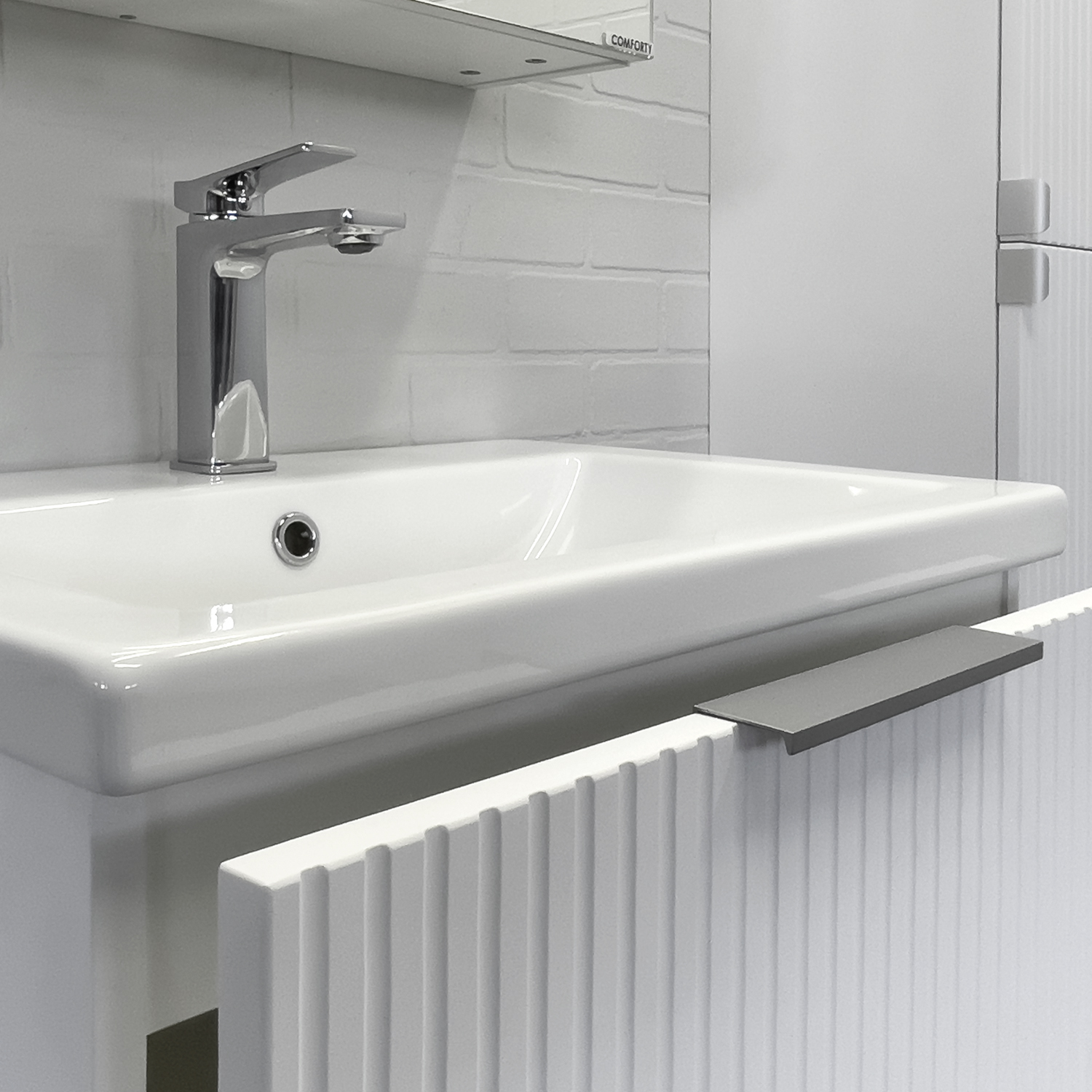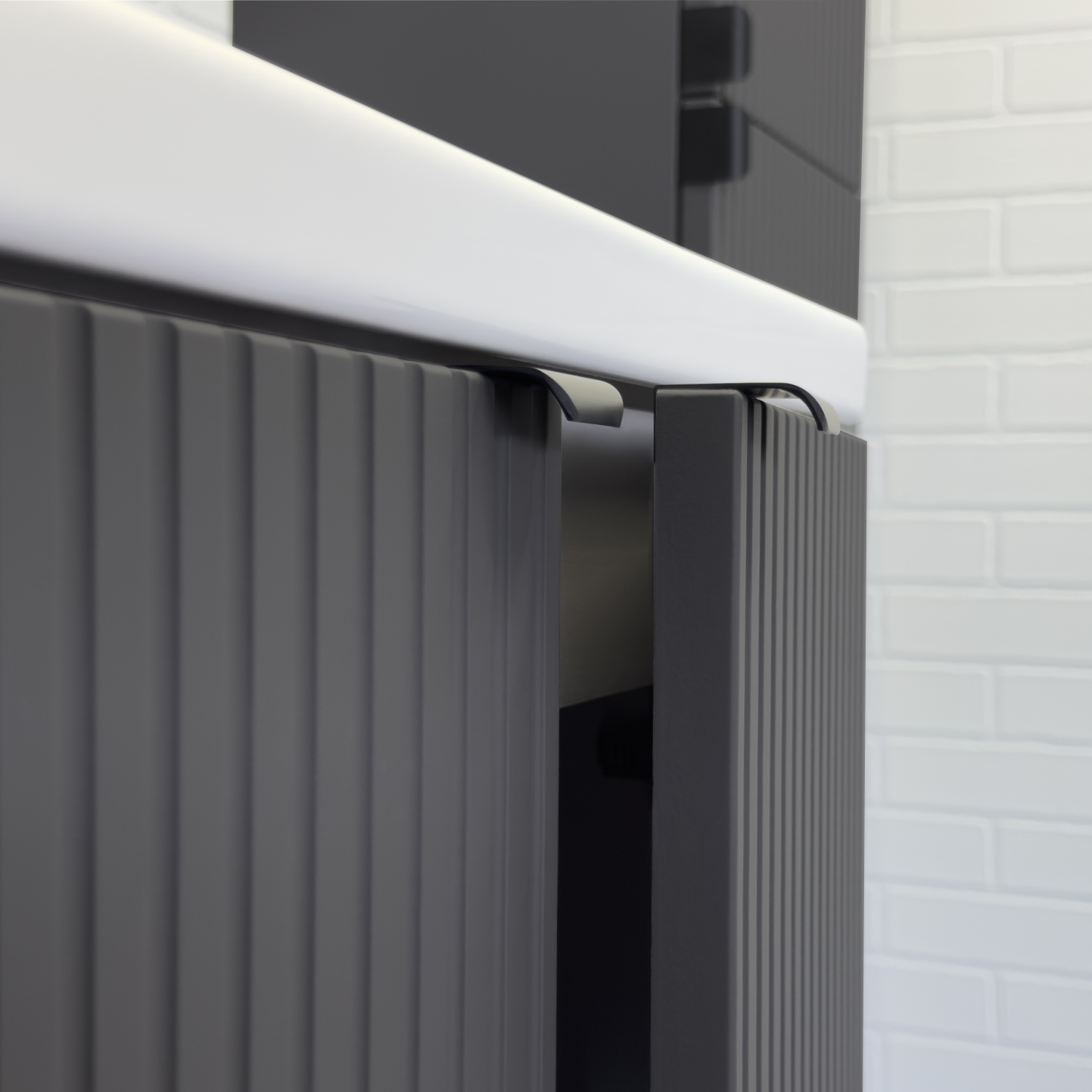 Фасады и корпуса изделий выполнены из МДФ в плёнке ПВХ Soft Touch с мягкой бархатистой поверхностью и декоративной фрезеровкой, создающей эффект премиальной отделки. В тумбах с ящиками используются направляющие скрытого монтажа Hettich с системой плавного закрывания, а в моделях со створками — петли COMFORTY с доводчиками; дополняют образ алюминиевые ручки и ножки в цвете матовый чёрный или сатин.