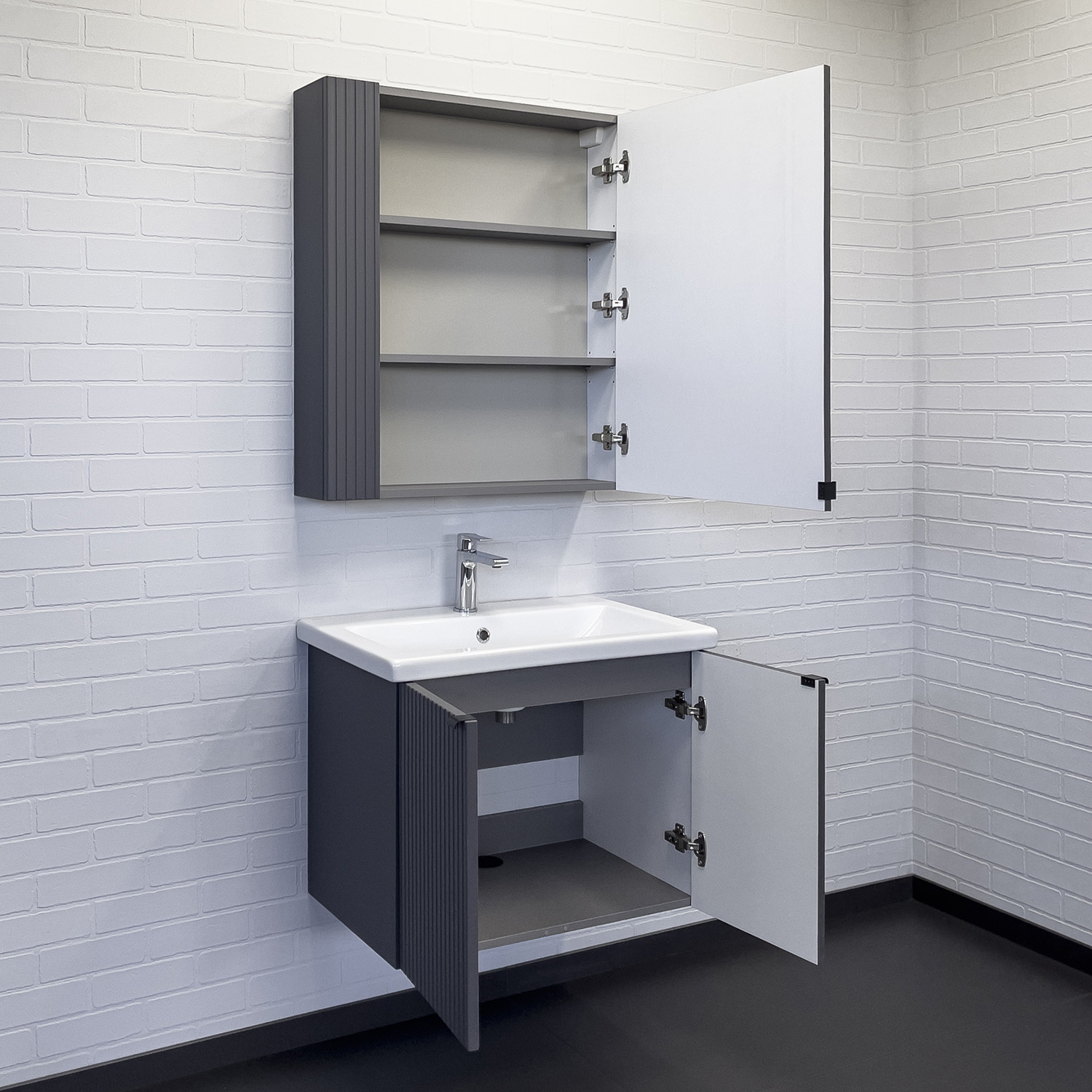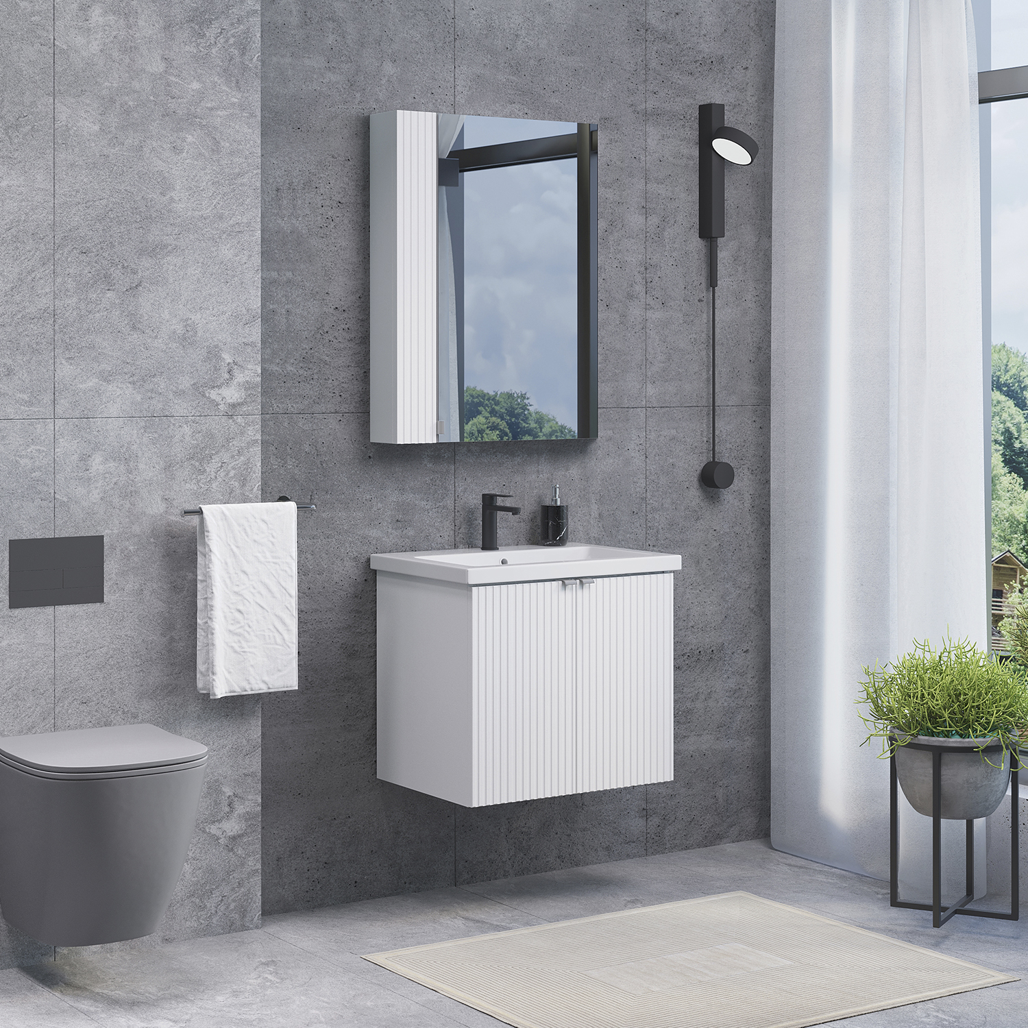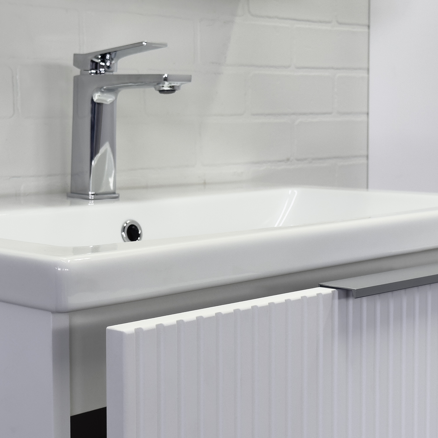 Фасады и корпуса изделий выполнены из МДФ в плёнке ПВХ Soft Touch с мягкой бархатистой поверхностью и декоративной фрезеровкой, создающей эффект премиальной отделки. В тумбах с ящиками используются направляющие скрытого монтажа Hettich с системой плавного закрывания, а в моделях со створками — петли COMFORTY с доводчиками; дополняют образ алюминиевые ручки и ножки в цвете матовый чёрный или сатин.