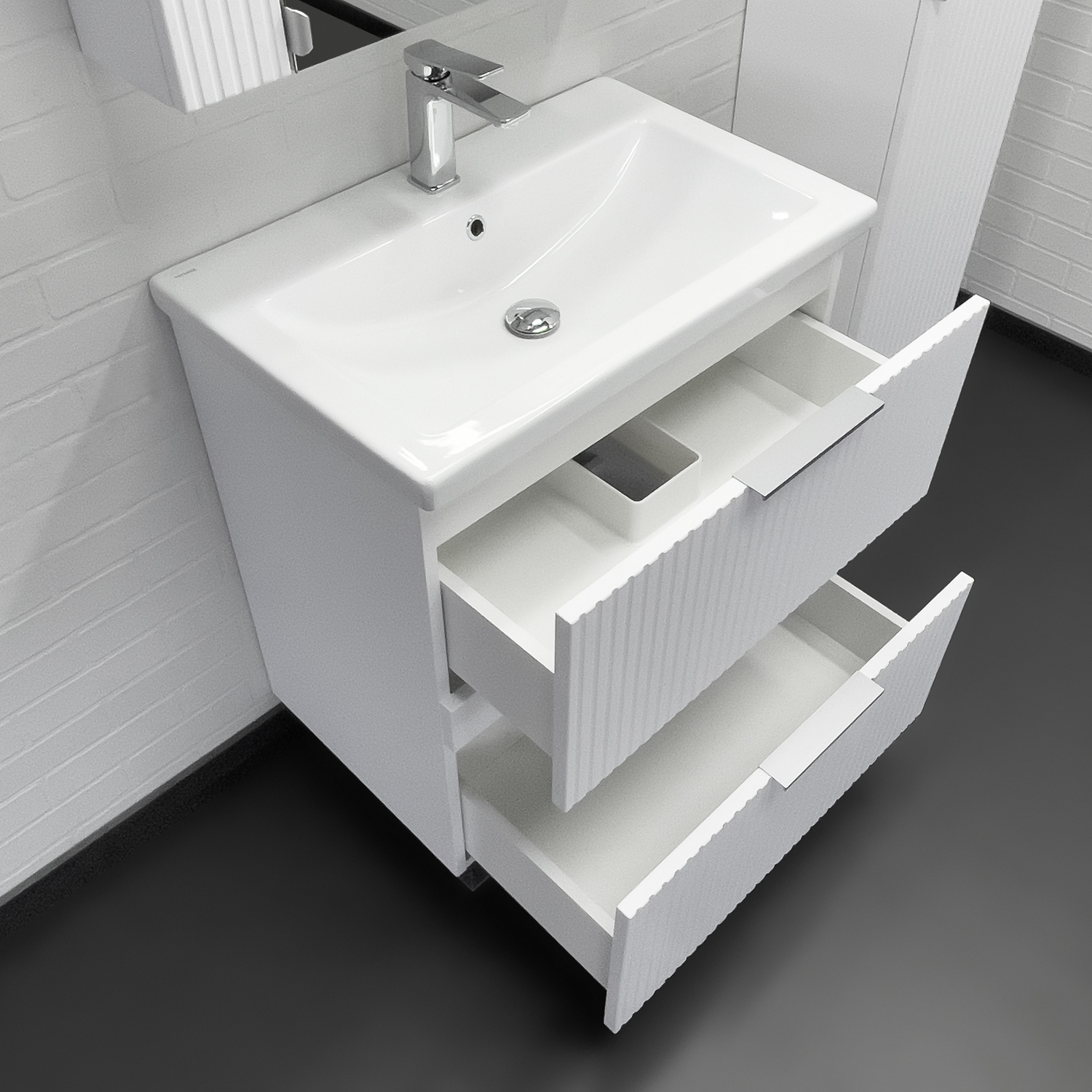 Линейка тумб представлена модификациями ЛИМА‑60 и ЛИМА‑70: напольные модели с дверцами (ЛИМА‑60H / 70H), с двумя выкатными ящиками (ЛИМА‑60H2 / 70H2), а также подвесные версии с дверцами (ЛИМА‑60П / 70П) и с ящиками (ЛИМА‑60П2 / 70П2). Все тумбы комплектуются раковинами СОМО 60 и СОМО 70 из белоснежного санфарфора с глубокой чашей и хромированным переливным кольцом, что подчёркивает аккуратный внешний вид и удобство эксплуатации.